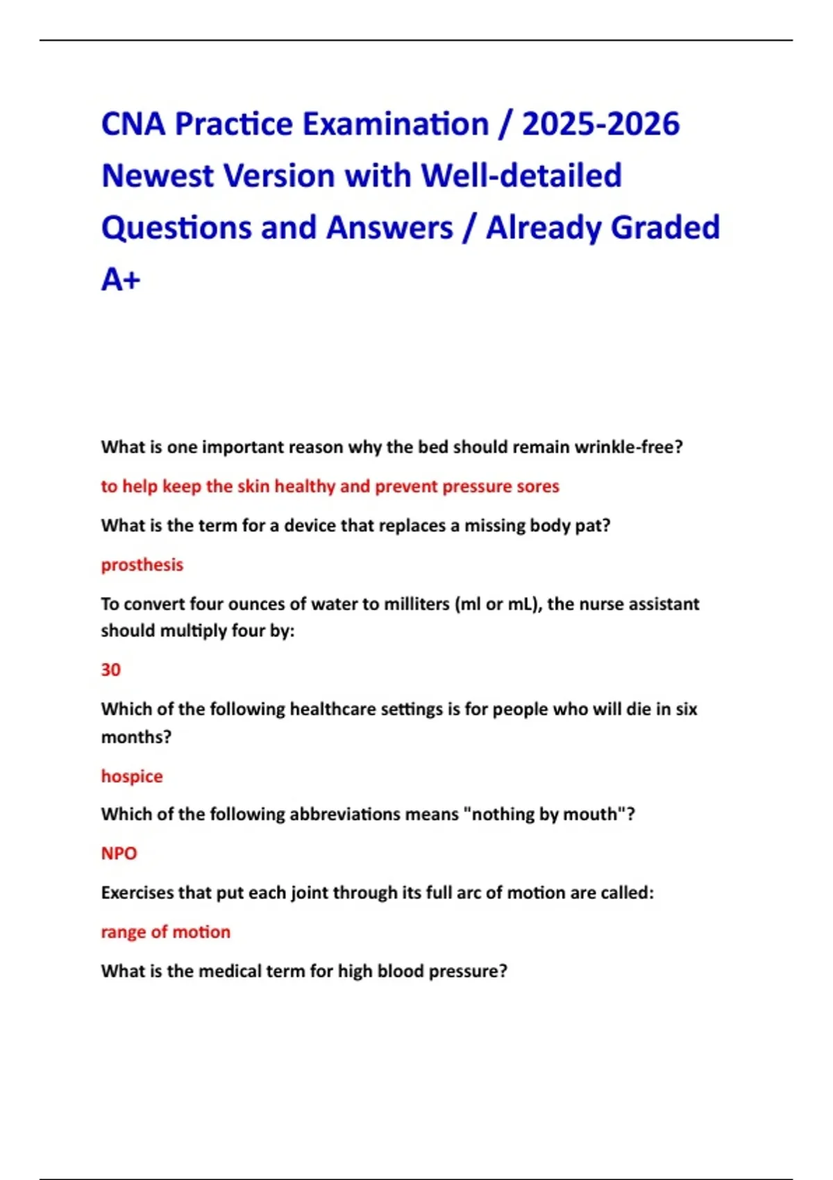 CNA Practice Examination / Newest Version with Well-detailed Questions and Answers / Already Graded A+