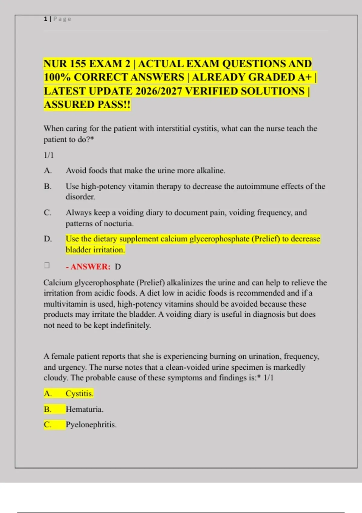 NUR 155 EXAM 2 | ACTUAL EXAM QUESTIONS AND 100% CORRECT ANSWERS | ALREADY GRADED A+ | LATEST UPDATE 2026/2027 VERIFIED SOLUTIONS | ASSURED PASS!! When caring for the patient with interstitial cystitis, what can the nurse teach the patient to do?* 1/1 A. Avoid foods that make the urine more alkaline. B. Use high-potency vitamin therapy to decrease the autoimmune effects of the disorder. C. Always keep a voiding diary to document pain, voiding frequency, and patterns of nocturia. D. Use the dietary supplement calcium glycerophosphate (Prelief) to decrease bladder irritation. - ANSWER: D Calcium glycerophosphate (Prelief) alkalinizes the urine and can help to relieve the irritation from acidic foods. A diet low in acidic foods is recommended and if a multivitamin is used, high-potency vitamins should be avoided because these products may irritate the bladder. A voiding diary is useful in diagnosis but does not need to be kept indefinitely. A female patient reports that she is experiencing burning on urination, frequency, and urgency. The nurse notes that a clean-voided urine specimen is markedly cloudy. The probable cause of these symptoms and findings is:* 1/1 A. Cystitis. B. Hematuria. C. Pyelonephritis. 2 | P a g e D. Dysuria. - ANSWER: A Signs and symptoms of cystitis are as follows: Abdominal or flank pain/tenderness, frequency and urgency of urination, Pain on voiding, Nocturia, Nausea, Fever, Cloudy urine, Hematuria, Vomiting An older male patient states that he is having problems starting and stopping his stream of urine and he feels the urgency to void. The best way to assist this patient is to* 1/1 A. Help him stand to void. B. Place a condom catheter. C. Have him practice Credé's method. D. Initiate Kegel exercises. - ANSWER: D Kegel exercises strengthen pelvic floor muscles and are effective in urine control in patients with urge incontinence and difficulty starting and stopping urination. A 24-year-old female client comes to an ambulatory care clinic in moderate distress with a probable diagnosis of acute cystitis. When obtaining the client's history, the nurse should ask the client if she has had:* 1/1 A. Fever and chills. B. Frequency and burning on urination. C. Flank pain and nausea. 3 | P a g e D. Hematuria. - ANSWER: B The classic symptoms of cystitis are severe burning on urination, urgency, and frequent urination. Systemic symptoms, such as fever and nausea and vomiting, are more likely to accompany pyelonephritis than cystitis. Hematuria may occur, but it is not as common as frequency and burning. A client who has been diagnosed with renal calculi reports that the pain is intermittent and less colicky. Which of the following nursing actions is most important at this time?* 1/1 A. Report hematuria to the physician. B. Strain the urine carefully. C. Administer meperidine (Demerol) every 3 hours. D. Apply warm compresses to the flank area. - ANSWER: B Intermittent pain that is less colicky indicates that the calculi may be moving along the urinary tract. Fluids should be encouraged to promote movement, and the urine should be strained to detect passage of the stone. Hematuria is to be expected from the irritation of the stone. Analgesics should be administered when the client needs them, not routinely. Moist heat to the flank area is helpful when renal colic occurs, but it is less necessary as pain is lessened. The client is scheduled for an intravenous pyelogram (IVP) to determine the location of the renal calculi. Which of the following measures would be most important for the nurse to include in pretest preparation?* 1/1 A. Ensuring adequate fluid intake on the day of the test. 4 | P a g e B. Preparing the client for the possibility of bladder spasms during the test. C. Checking the client's history for allergy to iodine. D. Determining when the client last had a bowel movement. - ANSWER: C In cystitis to minimize experiencing nocturia, the nurse would teach the patient to:* 1/1 A. Perform perineal hygiene after urinating. B. Set up a toileting schedule. C. Double void. D. Limit fluids before bedtime. - ANSWER: D With nocturia the patient has to get up during the night to urinate. Limiting fluids 2 hours before bedtime minimizes nocturia. A client scheduled for an IVP should be assessed for allergies to iodine and shellfish. Clients with such allergies may be allergic to the IVP dye and be at risk for an anaphylactic reaction. Adequate fluid intake is important after the examination. Bladder spasms are not common during an IVP. Bowel preparation is important before an IVP to allowvisualization of the ureters and bladder, but checking for allergies is most important. After an intravenous pyelogram (IVP), the nurse should anticipate incorporating which of the following measures into the client's plan of care?* 1/1 5 | P a g e A. Maintaining bed rest. B. Encouraging adequate fluid intake. C. Assessing for hematuria. D. Administering a laxative.