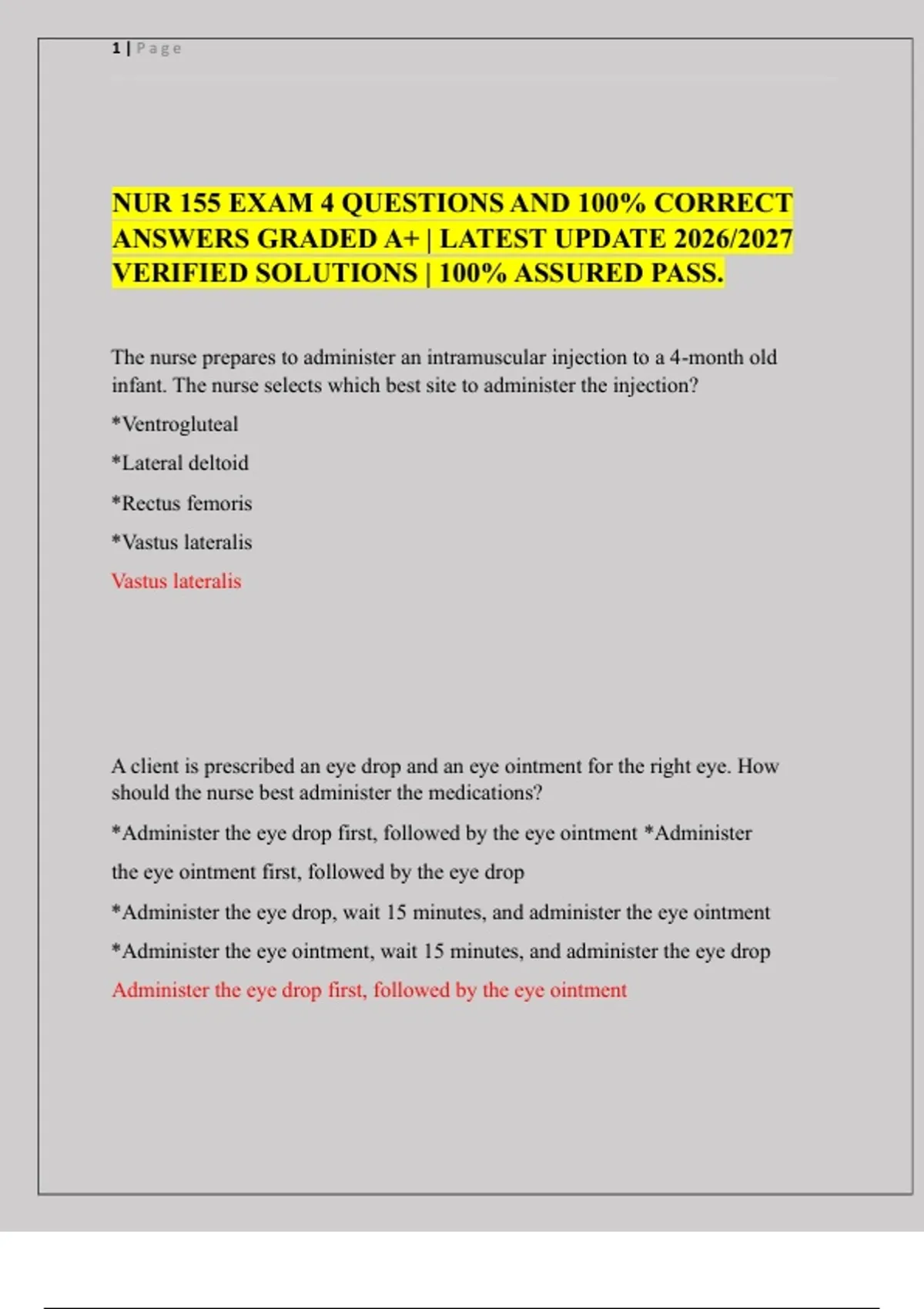 NUR 155 EXAM 4 QUESTIONS AND 100% CORRECT