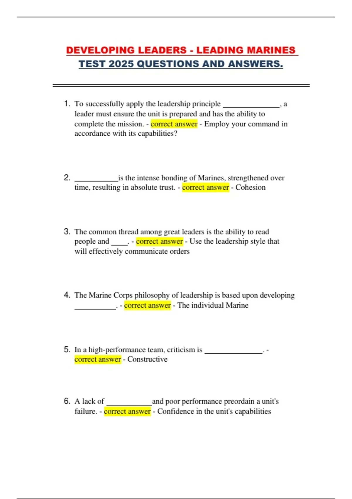 4. The Marine Corps philosophy of leadership is based upon developing