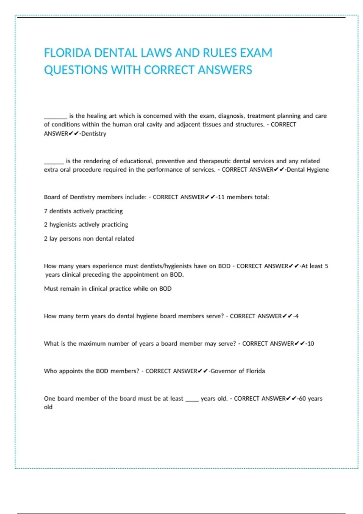 Florida Dental Laws and Rules Exam Questions With Correct Answers