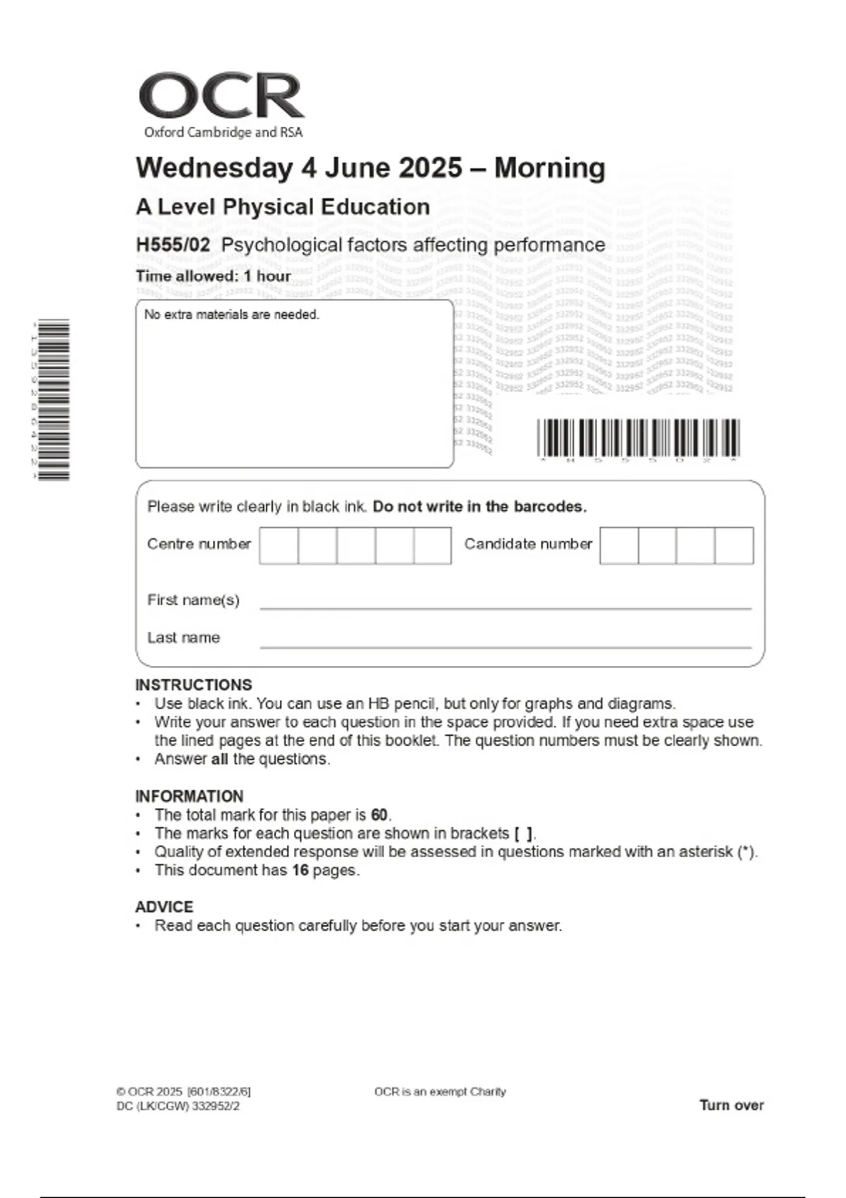 2025 OCR A Level Physical Education H555/02 Psychological factors affecting performance Combined Question Paper & Final Marking Scheme