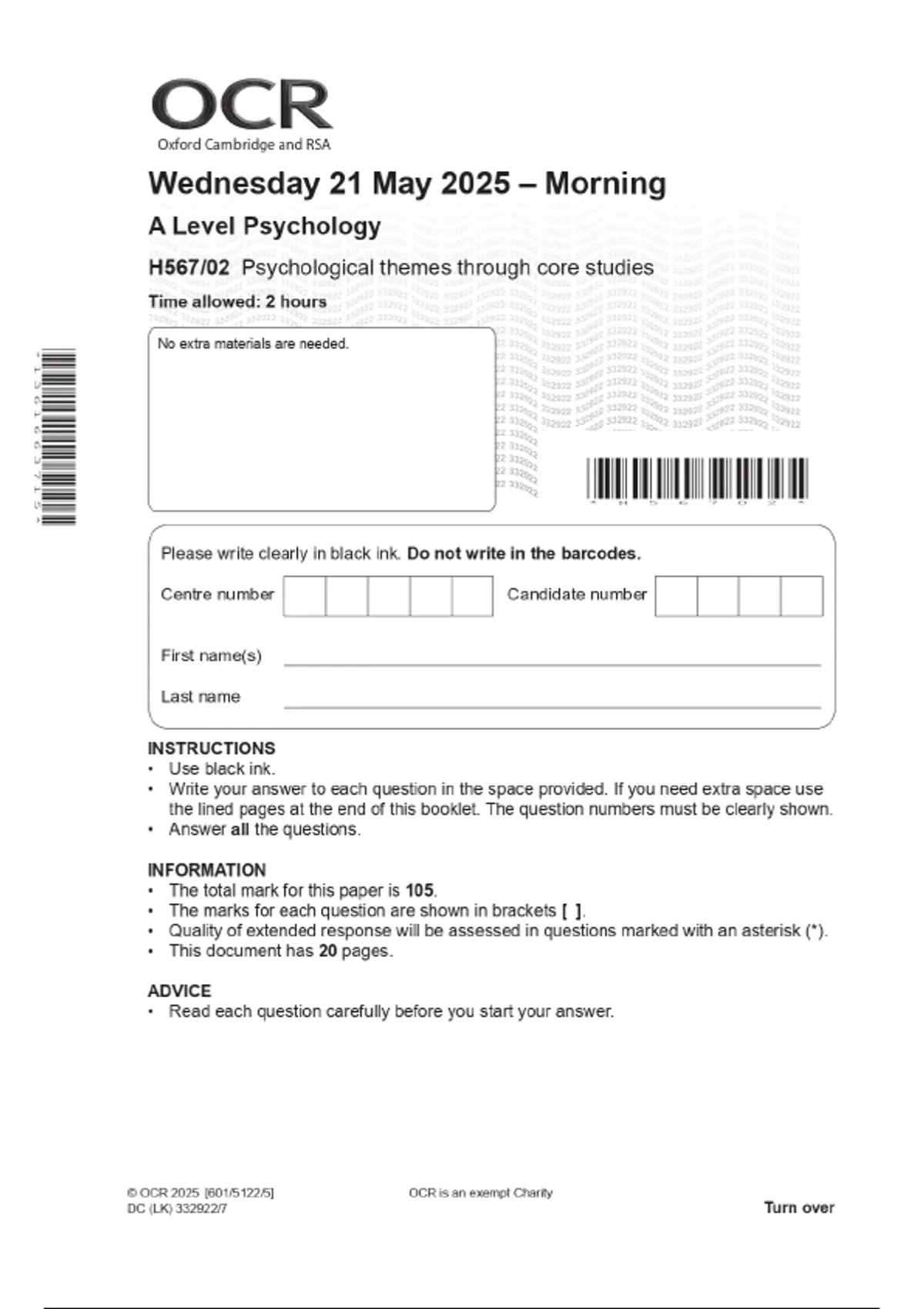 2025 OCR A Level Psychology H567/02 Psychological themes through core studies Combined Question Paper & Final Marking Scheme