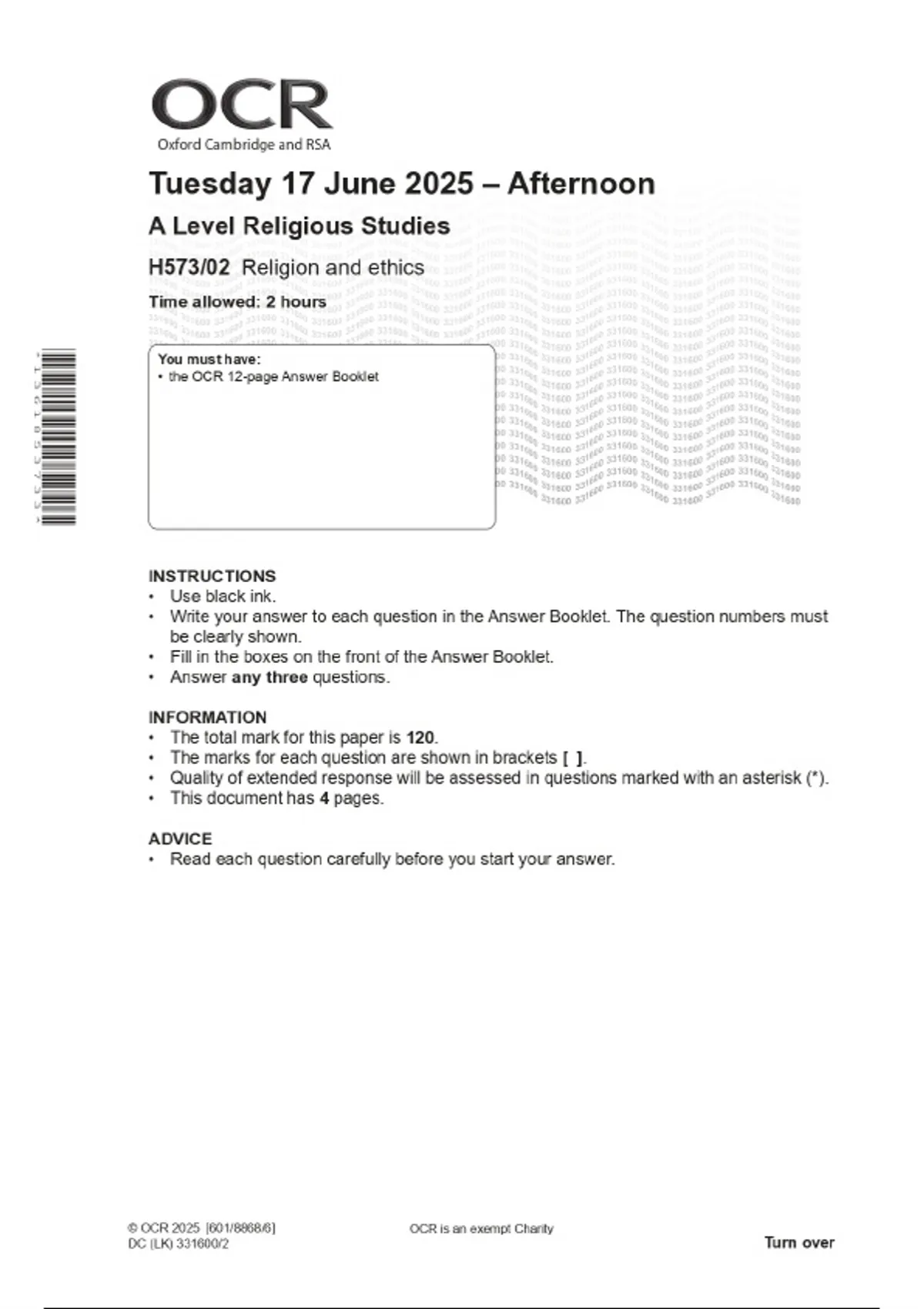 2025 OCR A Level Religious Studies H573/02 Religion and ethics Combined Question Paper & Final Marking Scheme