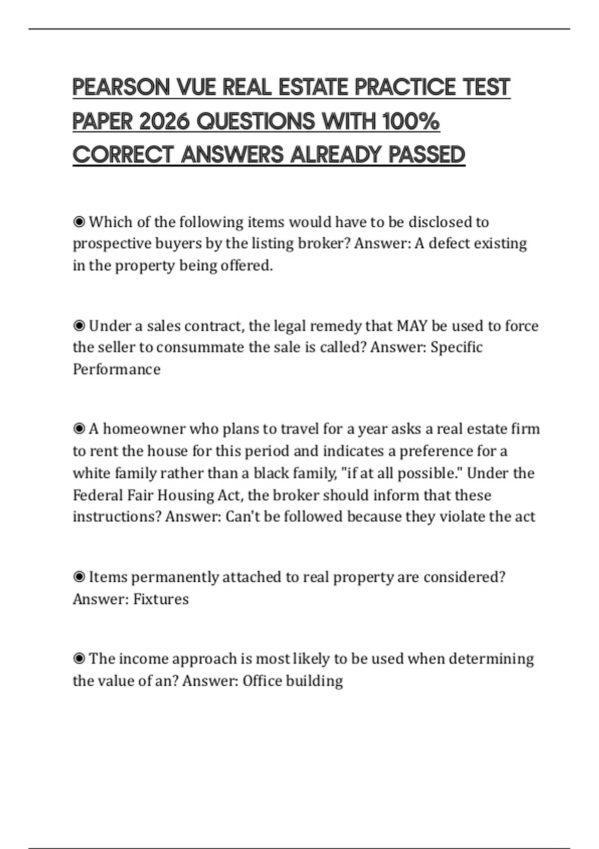 PEARSON VUE REAL ESTATE PRACTICE TEST PAPER 2026 QUESTIONS WITH 100% CORRECT ANSWERS ALREADY PASSED