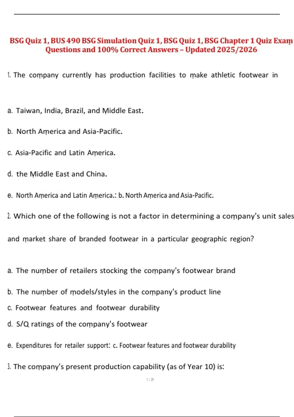 This document contains the complete set of BSG Quiz 1, BUS 490 BSG Simulation Quiz 1, and Chapter 1 quiz questions with fully verified, 100% correct answers for the 2025/2026 academic cycle. It covers all foundational Business Strategy Game concepts introduced in Chapter 1, including industry structure, competitive environment, company performance metrics, strategic decision areas, and the simulation’s core operational components. Designed to align with BSG course requirements, this resource supports accurate, thorough preparation for early-stage quizzes.