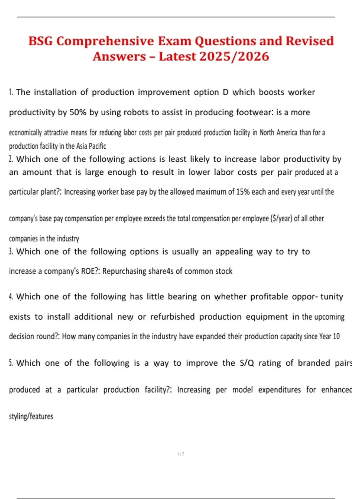 This document provides a full set of comprehensive exam questions and revised, accurate answers for the 2025/2026 BSG assessment. It covers the major concepts, analytical skills, and scenario-based decision-making elements commonly tested in BSG coursework. The material is organized to support clear understanding of key principles and reflects the latest updates for the current academic cycle. It serves as a complete and reliable study resource for exam preparation.