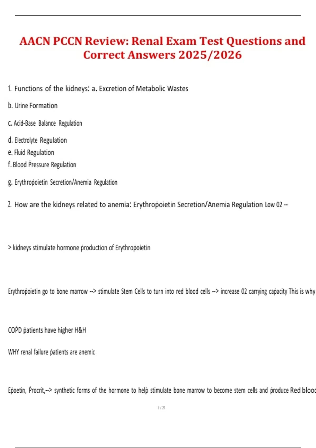 This document provides updated 2025/2026 AACN PCCN renal-focused exam test questions with fully correct answers. It covers essential renal system topics assessed on the PCCN exam, including acute kidney injury, chronic kidney disease, electrolyte imbalances, fluid regulation, renal replacement therapies, and nursing interventions for progressive care patients. The answers are revised for accuracy and aligned with current AACN standards, making this guide ideal for targeted renal system preparation.