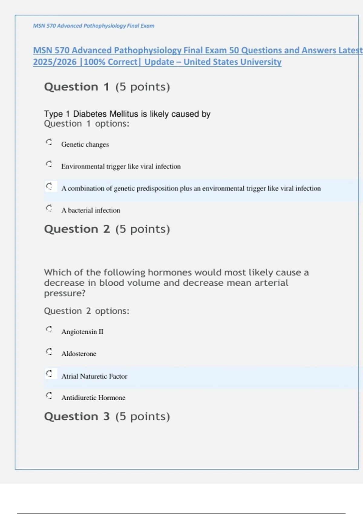 MSN 570 Advanced Pathophysiology Final Exam 50 Questions and Answers Latest 2025/2026 |100% Correct| Update – United States University