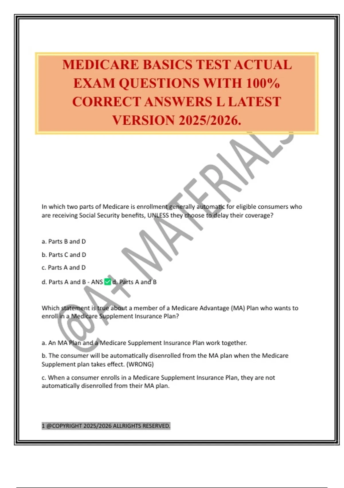 MEDICARE BASICS TEST ACTUAL EXAM QUESTIONS WITH 100% CORRECT ANSWERS L LATEST VERSION 2025/2026.