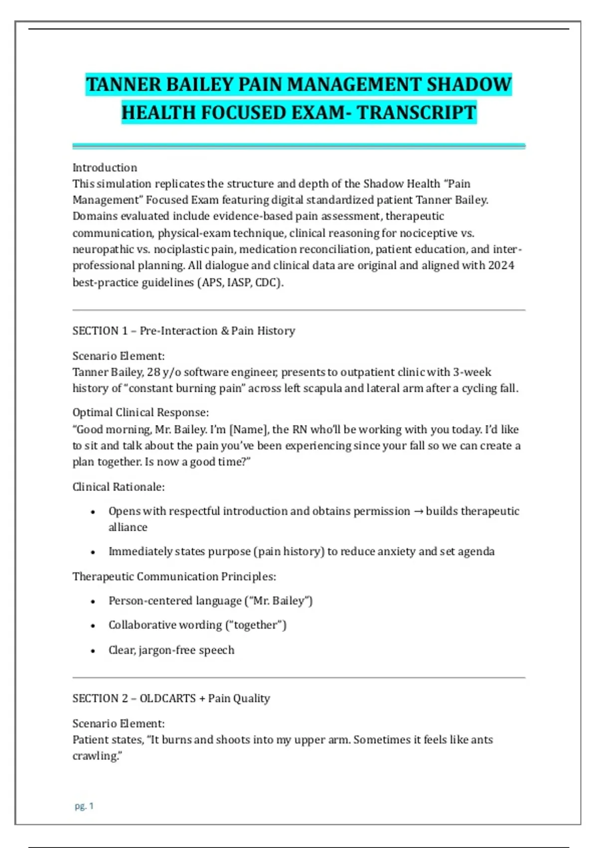 This document provides the complete transcript and solutions for the Tanner Bailey Pain Management Shadow Health Focused Exam. Includes comprehensive patient interaction dialogue, assessment techniques, pain evaluation methods, treatment planning, and appropriate clinical decision-making for effective pain management scenarios. Perfect for nursing and healthcare students seeking to master patient communication and pain assessment skills.