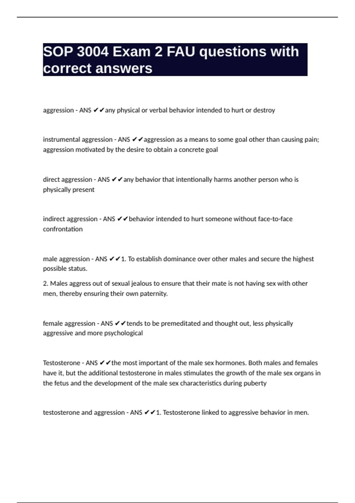 testosterone and aggression - ANS ✔✔1. Testosterone linked to aggressive behavior in men.