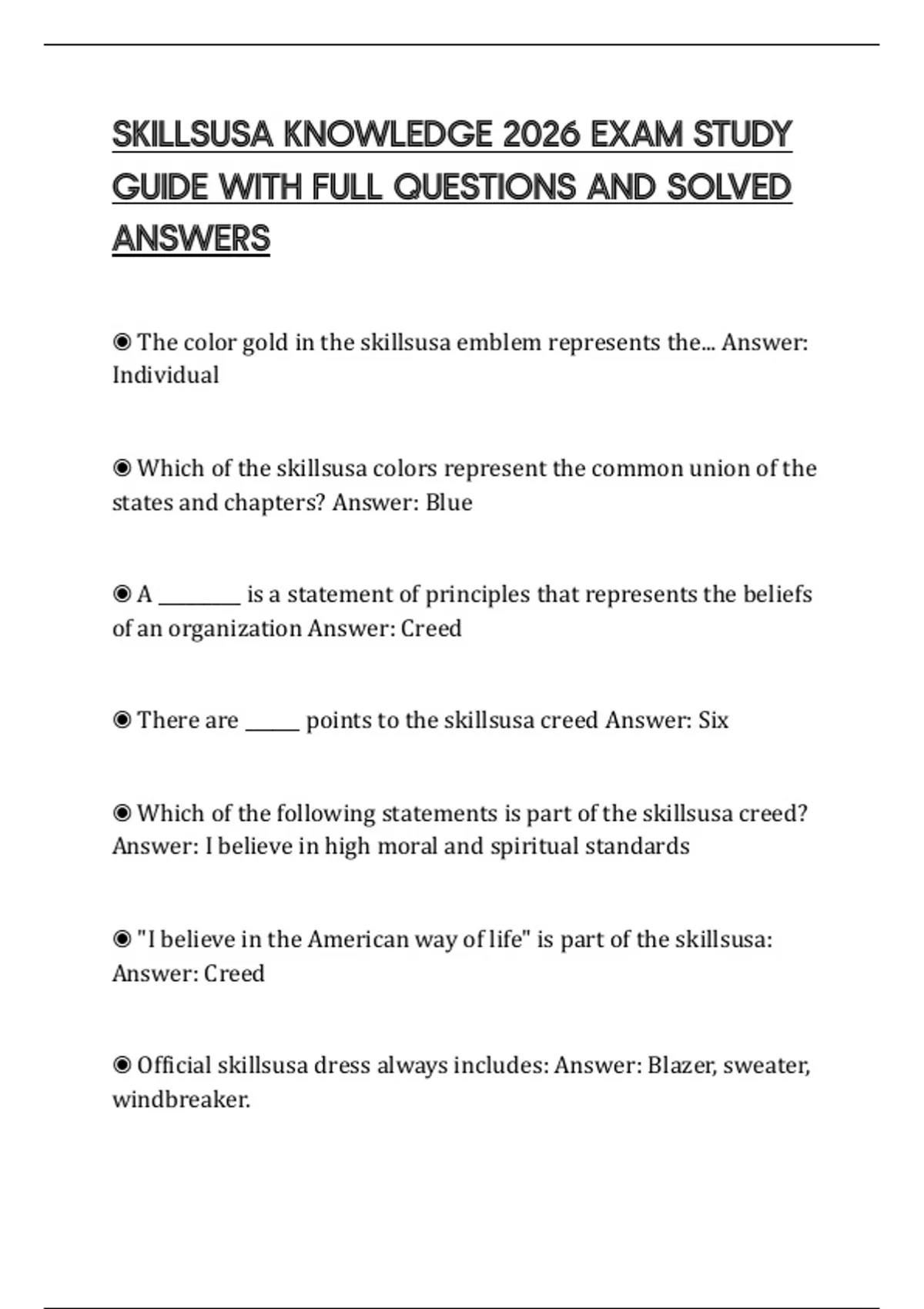 ◉ There are ______ points to the skillsusa creed Answer: Six
