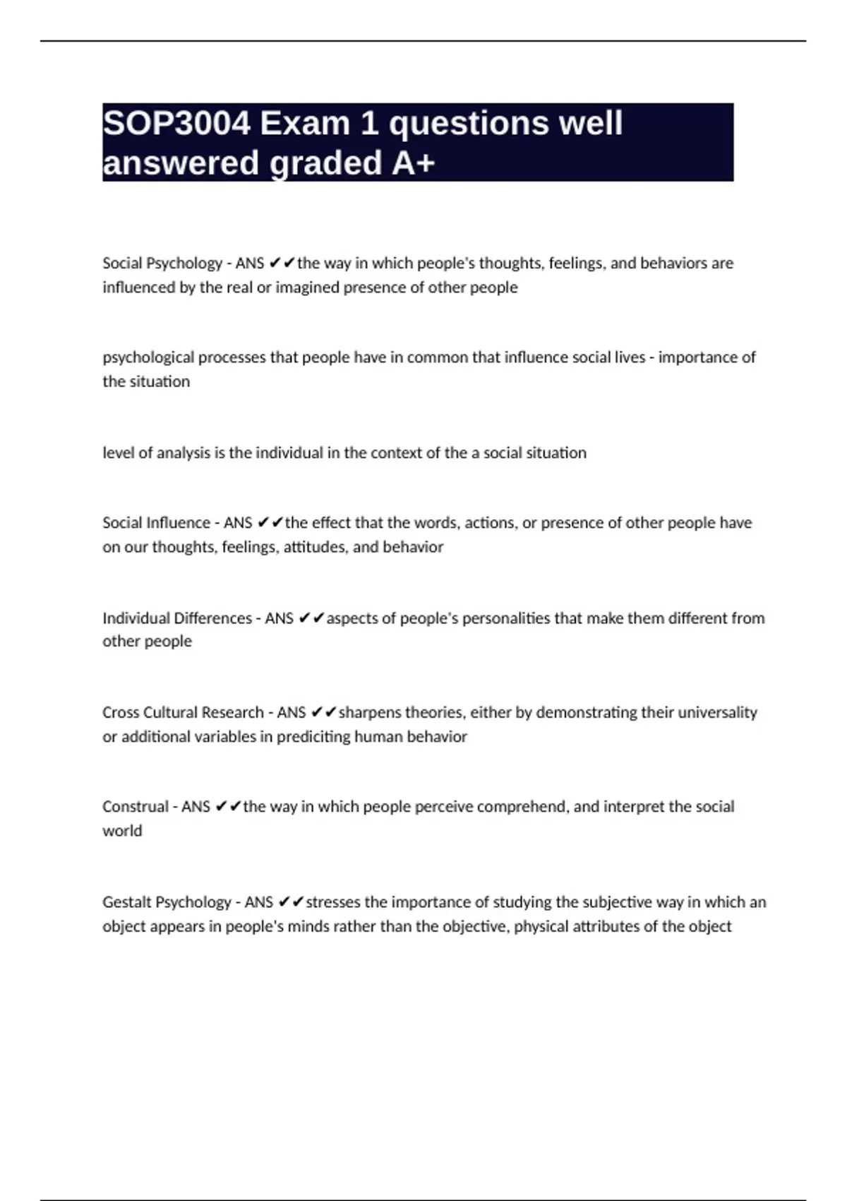 Social Psychology - ANS ✔✔the way in which people's thoughts, feelings, and behaviors are