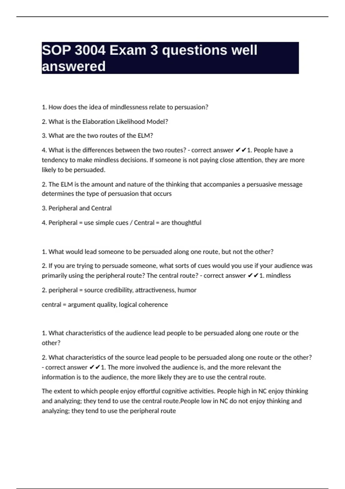primarily using the peripheral route? The central route? - correct answer ✔✔1. mindless