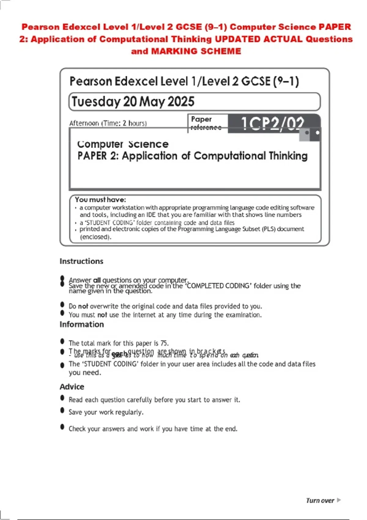 Pearson Edexcel Level 1/Level 2 GCSE (9–1) Computer Science PAPER 2: Application of Computational Thinking UPDATED ACTUAL Questions and MARKING SCHEME