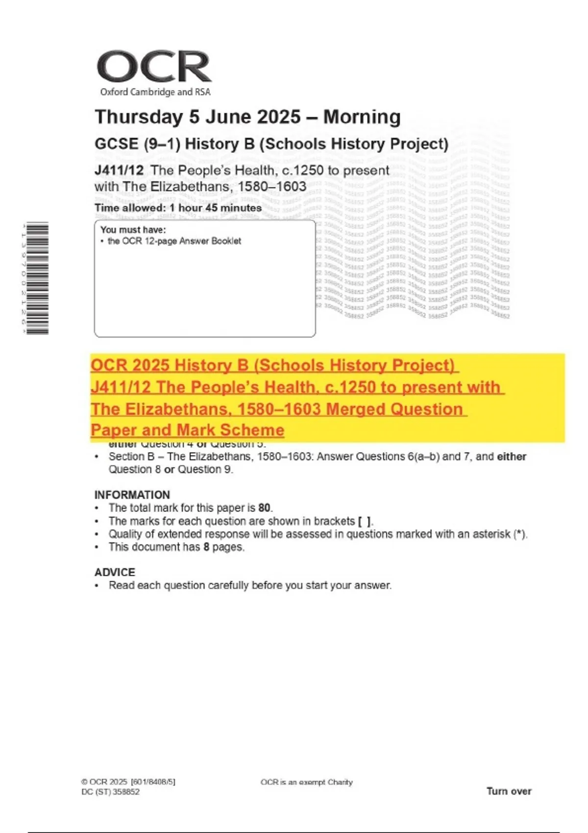 OCR 2025 History B (Schools History Project) J411/12 The People’s Health, c.1250 to present with The Elizabethans, 1580–1603 Merged Question Paper and Mark Scheme