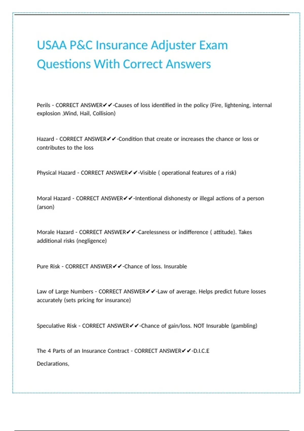 The |4 |Parts |of |an |Insurance |Contract |- |CORRECT |ANSWER✔✔-D.I.C.E