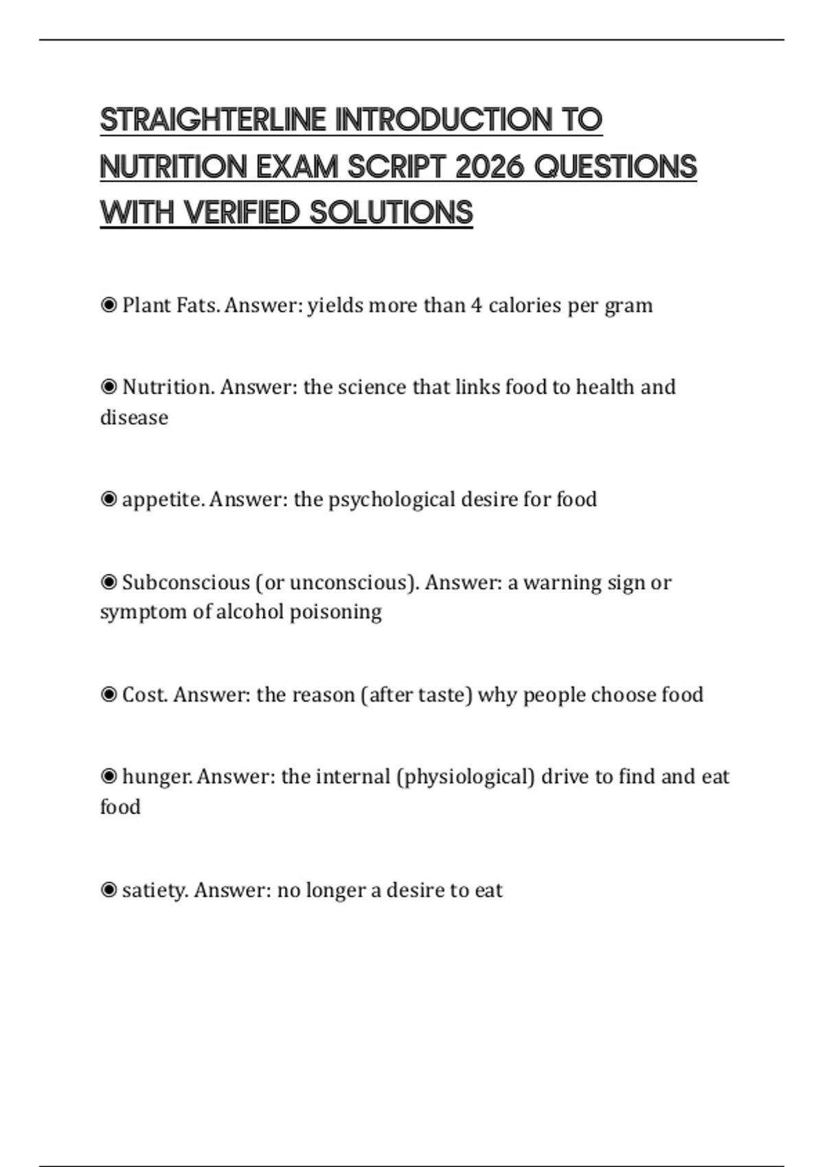 STRAIGHTERLINE INTRODUCTION TO NUTRITION EXAM SCRIPT 2026 QUESTIONS WITH VERIFIED SOLUTIONS