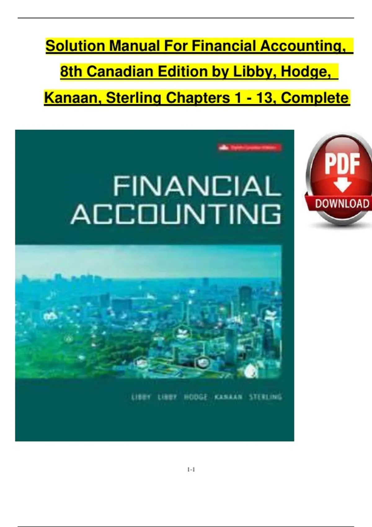 This complete solution manual for Financial Accounting, 8th Canadian Edition by Libby, Hodge, Kanaan, and Sterling provides detailed, step-by-step solutions for Chapters 1–13. It is designed for students who want clear explanations to strengthen their understanding of accounting principles, journal entries, financial statements, and decision-making concepts. Each chapter includes fully worked examples that follow the textbook structure, making it ideal for exam revision, homework checks, and mastering fundamental accounting methods.