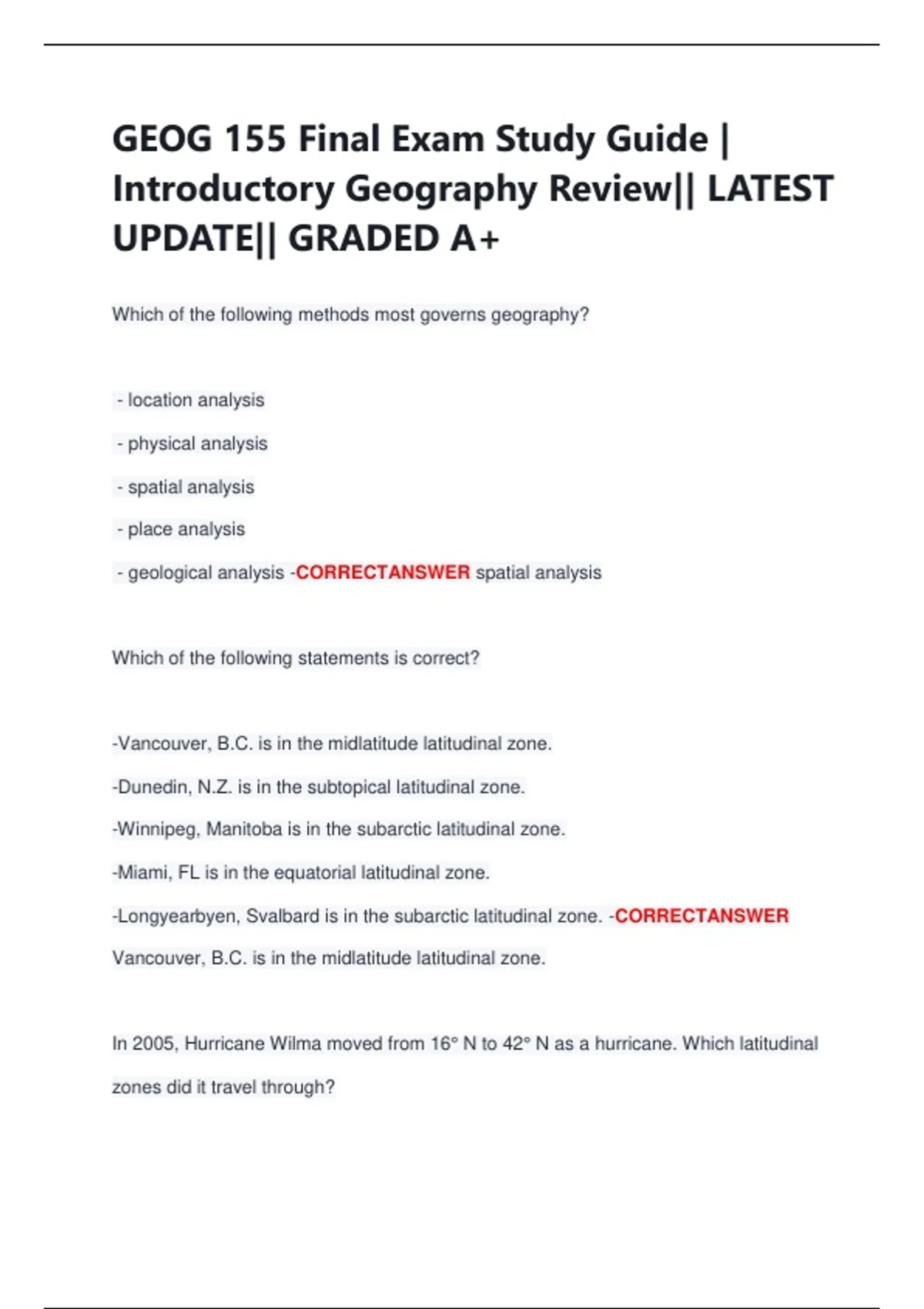 GEOG 155 Final Exam Study Guide | Introductory Geography Review|| LATEST UPDATE|| GRADED A+