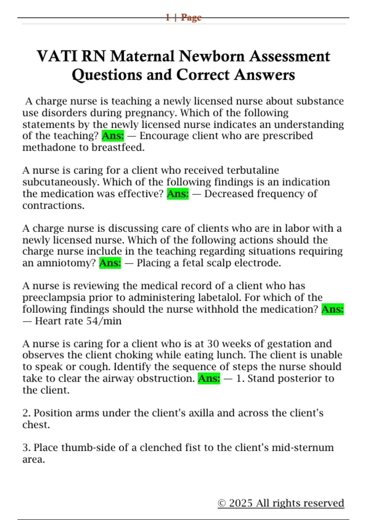 VATI RN Maternal Newborn Assessment Questions and Correct AnswersVATI RN Maternal Newborn Assessment Questions and Correct AnswersVATI RN Maternal Newborn Assessment Questions and Correct AnswersVATI RN Maternal Newborn Assessment Questions and Correct AnswersVATI RN Maternal Newborn Assessment Questions and Correct AnswersVATI RN Maternal Newborn Assessment Questions and Correct Answers