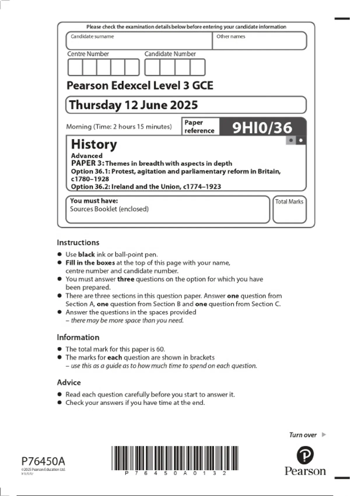 2025 Pearson Edexcel Level 3 GCE History Advanced PAPER 3: Themes in breadth with aspects in depth Option 36.1: Protest, agitation and parliamentary reform in Britain, c1780–1928 Option 36.2: Ireland and the Union, c1774–1923 Combined Question Paper a