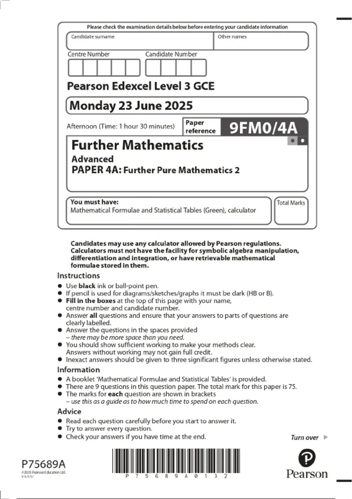 2025 Pearson Edexcel Level 3 GCE Further Mathematics Advanced PAPER 4A: Further Pure Mathematics 2 Combined Question Paper and Marking Scheme