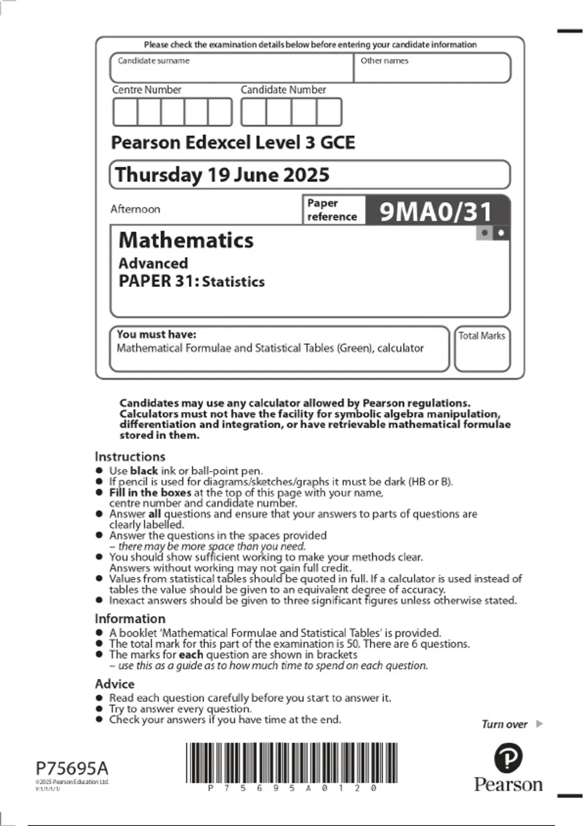 2025 Pearson Edexcel Level 3 GCE Mathematics Advanced PAPER 31: Statistics Combined Question Paper and Marking Scheme