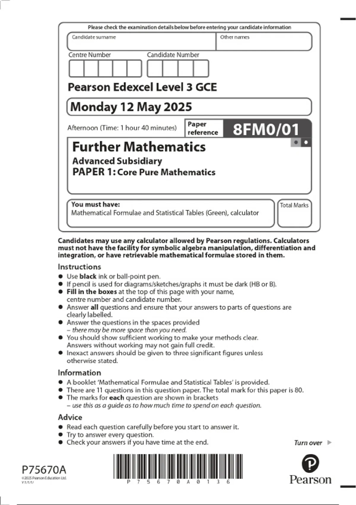 2025 Pearson Edexcel Level 3 GCE Further Mathematics Advanced Subsidiary PAPER 1: Core Pure Mathematics Combined Question Paper and Marking Scheme