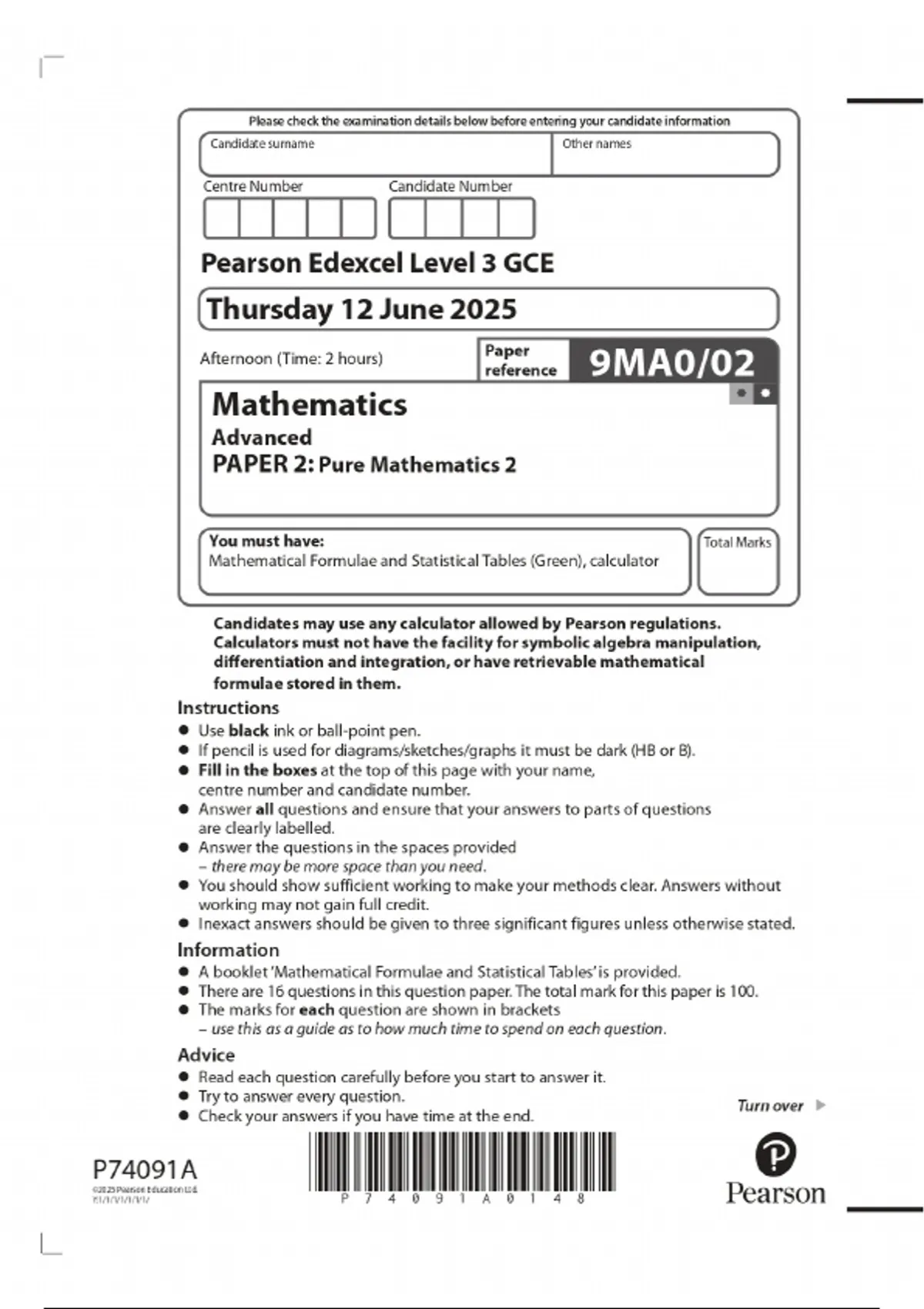 2025 Pearson Edexcel Level 3 GCE Further Mathematics Advanced PAPER 2: Pure Mathematics 2 Combined Question Paper and Marking Scheme