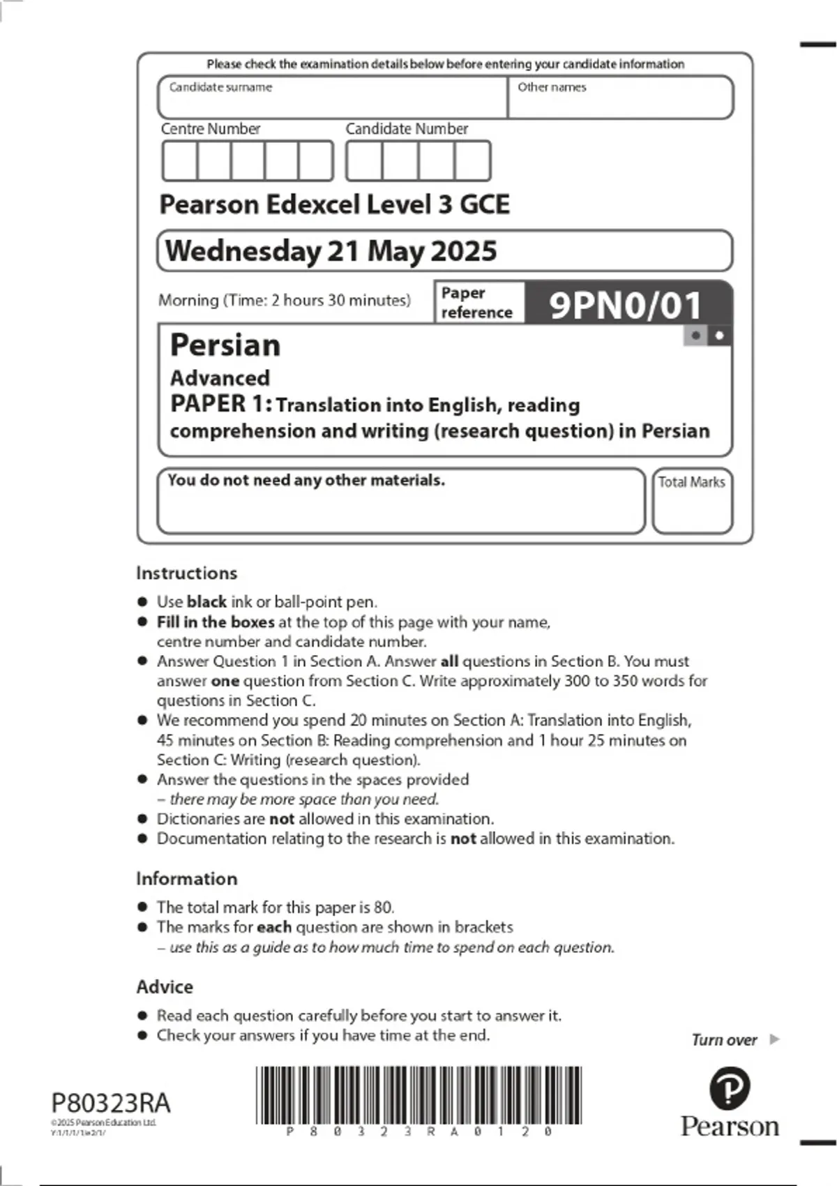 2025 Pearson Edexcel Level 3 GCE Persian Advanced PAPER 1: Translation into English, reading comprehension and writing (research question) in Persian Combined Question Paper and Marking Scheme