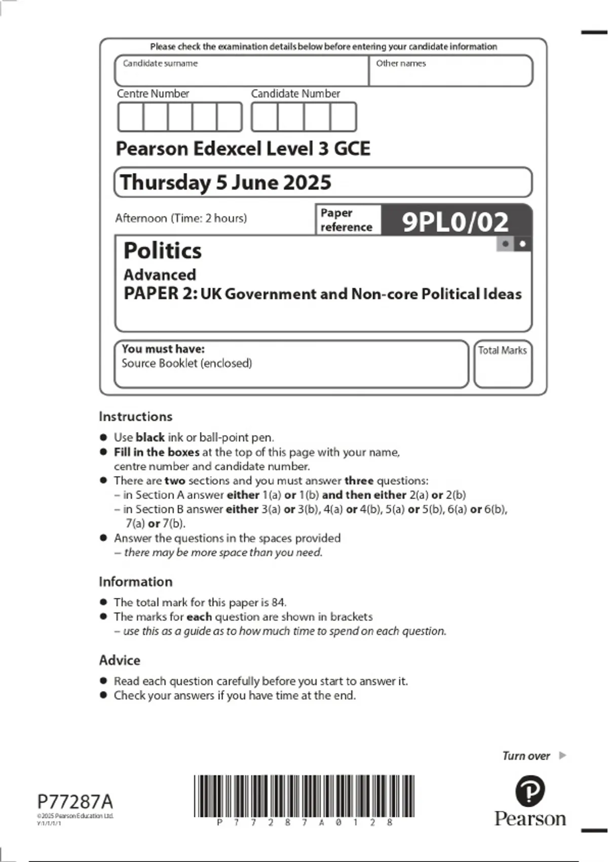 2025 Pearson Edexcel Level 3 GCE Politics Advanced PAPER 2: UK Government and Non-core Political Ideas Combined Question Paper and Marking Scheme