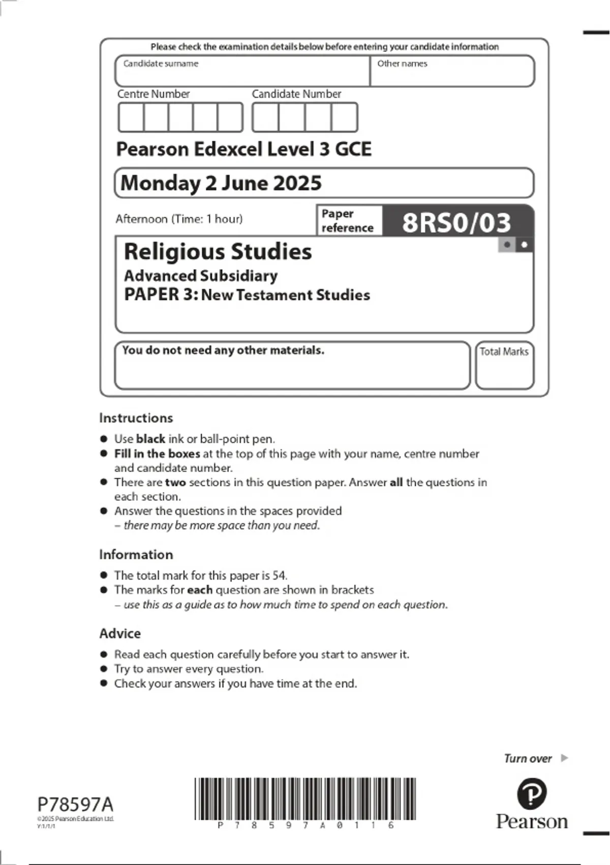 2025 Pearson Edexcel Level 3 GCE Religious Studies Advanced Subsidiary PAPER 3: New Testament Studies Combined Question Paper and Marking Scheme