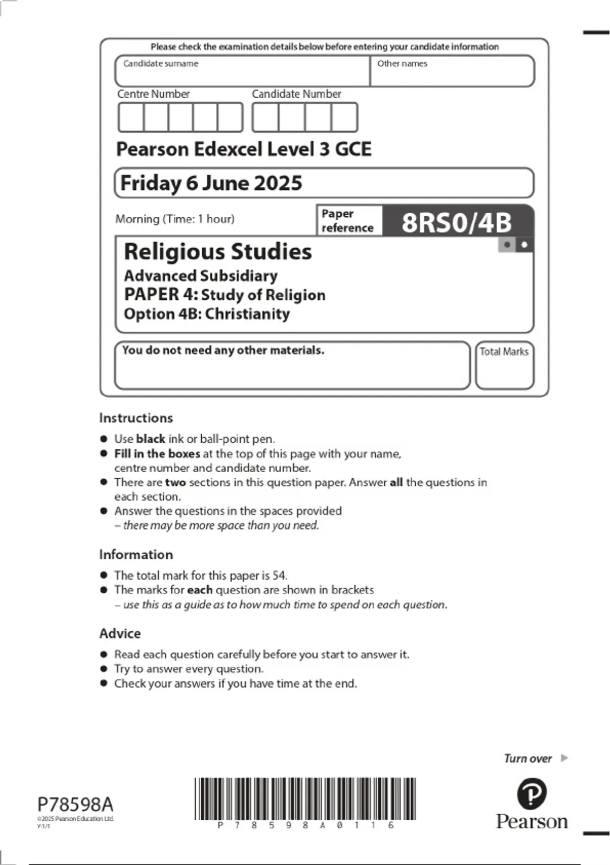 2025 Pearson Edexcel Level 3 GCE Religious Studies Advanced Subsidiary PAPER 4: Study of Religion Option 4B: Christianity Combined Question Paper and Marking Scheme