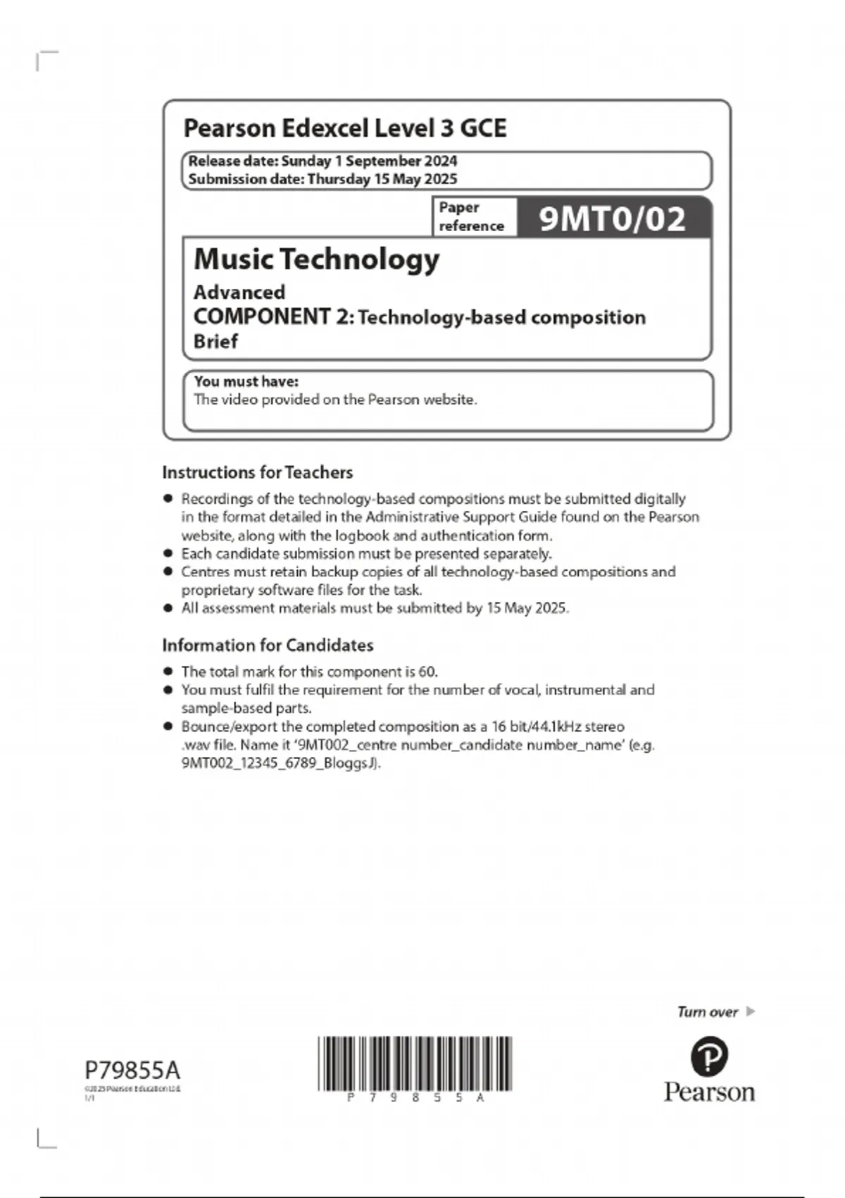 2025 Pearson Edexcel Level 3 GCE Music Technology Advanced COMPONENT 2: Technology-based composition Brief Combined Question Paper and Marking Scheme