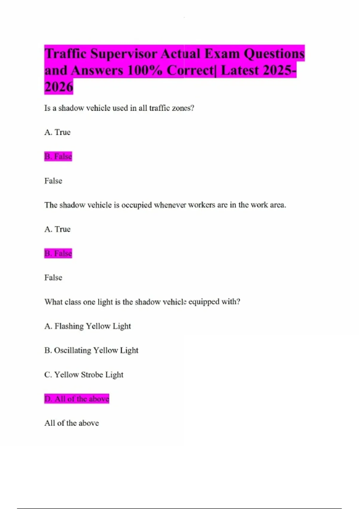 Traffic Supervisor Actual Exam Questions and Answers 100% Correct| Latest Is a shadow vehicle used in all traffic zones? A. True B. False False The shadow vehicle is occupied whenever workers are in the work area. A. True B. False False What class one light is the shadow vehicle equipped with? A. Flashing Yellow Light B. Oscillating Yellow Light C. Yellow Strobe Light D. All of the above All of the above When may cones be substituted for drums? A. Daytime traffic control minimum height 18" B. Daytime traffic control minimum height 28" C. Daytime traffic control minimum height 36" D. Daytime traffic control minimum height 42" Daytime traffic control minimum height 28" When may cones be substituted for drums? A. Daytime traffic control minimum height 18" B. Daytime traffic control minimum height 28" C. Daytime traffic control minimum height 36" D. Daytime traffic control minimum height 42" Daytime traffic control minimum height 28" When cones are substituted for drums for nighttime closers, what is the minimum cone height requirement? A. 18" B. 28" C. 36" D. 42" 42" When cones are substituted for drums at nighttime closer, what is the maximum cone spacing? A. 20' B. 30' C. 40' D. 50' 40' What type of flashing warning lights are required when there is a nighttime lane closer? A. ROAD WORK AHEAD B. LANE CLOSED AHEAD C. A & B D. NONE OF THE ABOVE ROAD WORK AHEAD & LANE CLOSED AHEAD If there is a lane closure of greater than three days, what is required? A. Work zone dotted lines, 4' in length separated by 10' gaps, shall be provided to identify the merge. B. The appropriate color work zone edge lines shall be applied along the taper and tangent sections. C. All the above D. None of the above The appropriate color work zone edge lines shall be applied along the taper and tangent sections. Work zone pavement marking that conflict with final traffic lanes shall be temporary paint. A. True B. False False What are the extra advance warning signs? A. Lane Close Ahead B. Watch for Stopped Traffic C. Road Work Ahead D. All the above Lane Change Ahead & Watch for Stopped Traffic & Road Work Ahead Is the advisory speed plaque used in all traffic zones? A. True B. False False When the approach speed limit is 40 mph or less, 36" warning signs may be used. A. True B. False True Road Work Ahead signs shall be provided on entrance ramps or roadways entering the work limits. A. True B. False True End Road Work signs are only required for lane closures of more than ______ day. A. 1 B. 2 C. 3 D 4 1 Sign spacing should be adjusted to avoid conflict with existing signs, minimum spacing to existing signs shall be 200' for speeds of 45 mph or less and a minimum of 400' for speeds 50 mph or greater. A. True B. False True The minimum acceptable length for the merge taper shall be determined by _________ the width of the offset by the merge taper rate. A. Subtracting B. Adding C. Divide D. Multiplying Multiplying The tangent (recovery area) section between the two merge tapers should be 2 times longer of the two merge tapers. A. True B. False True What is a fundamental principle of temporary traffic control? A. To inconvenience motorists as much as possible so they will find another route. B. To guide and direct motorists through or around the work area as efficiently as possible. C. To make traffic move as slow as possible. D. All of the above are fundamental principles. To guide and direct motorists through or around the work area as efficiently as possible. What needs to be done when work is suspended for any length of time?