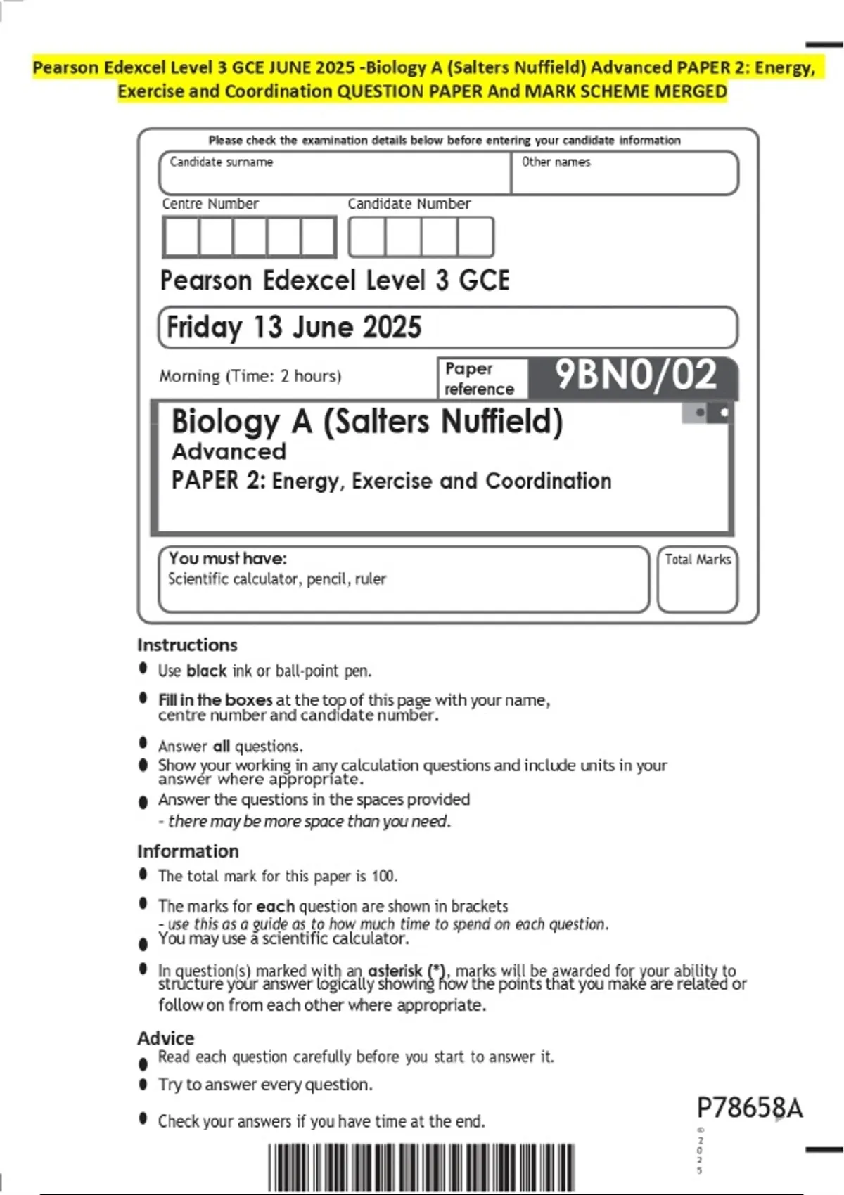 Pearson Edexcel Level 3 GCE JUNE 2025 -Biology A (Salters Nuffield) Advanced PAPER 2: Energy, Exercise and Coordination QUESTION PAPER And MARK SCHEME MERGED