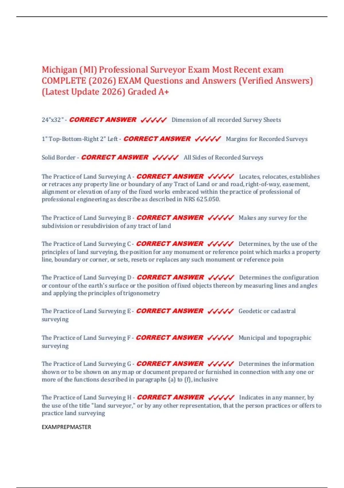 Not Practicing Land Surveying - CORRECT ANSWER ✔✔✔✔✔ Making a survey exclusively for