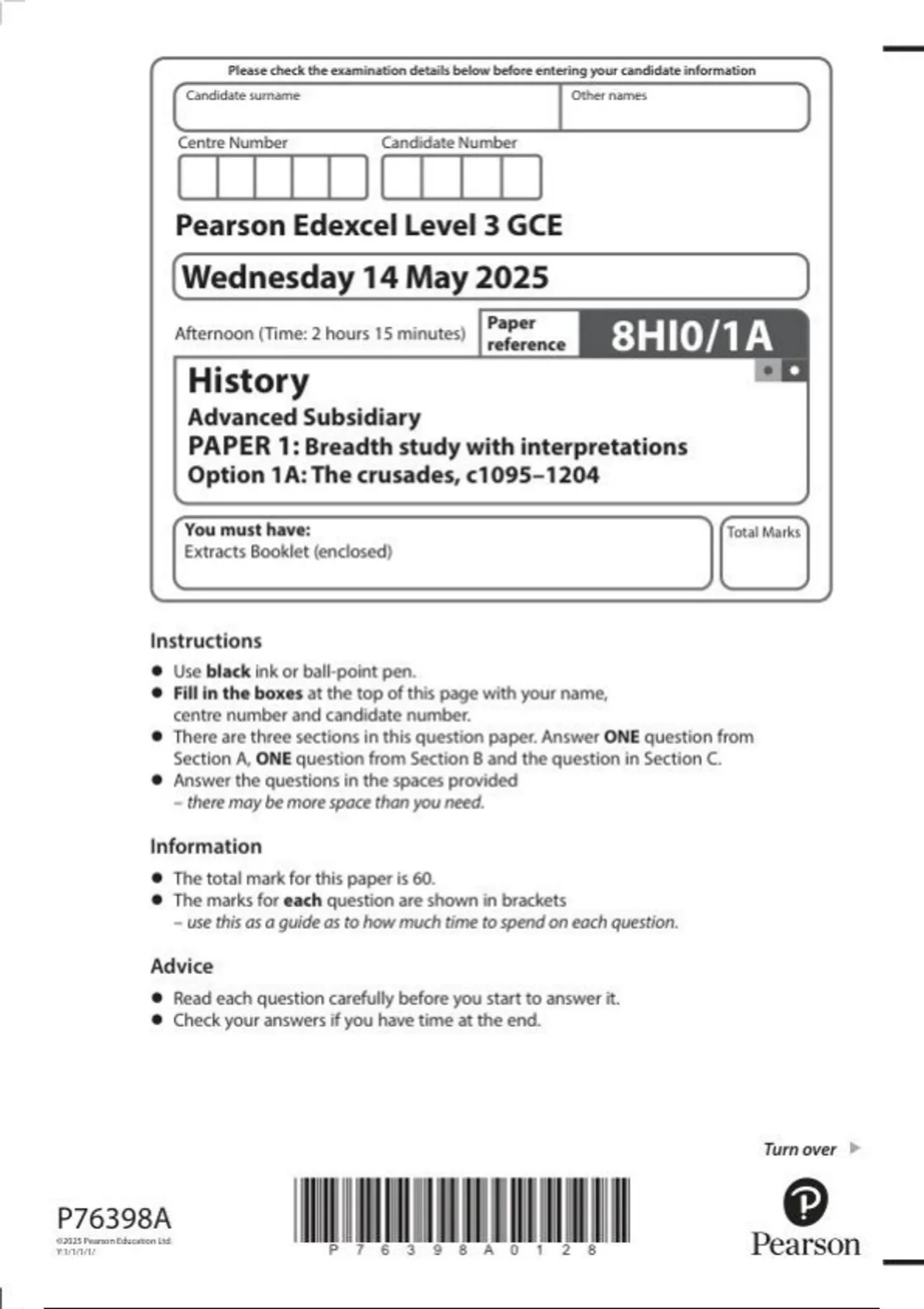 Pearson Edexcel as level History |question paper|2025|8HI0/1a