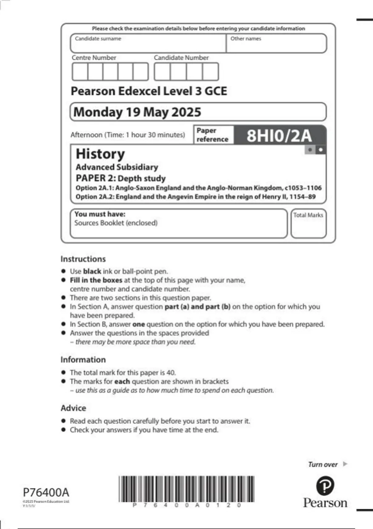 Pearson Edexcel as level History |question paper |2025|8HI0/2a