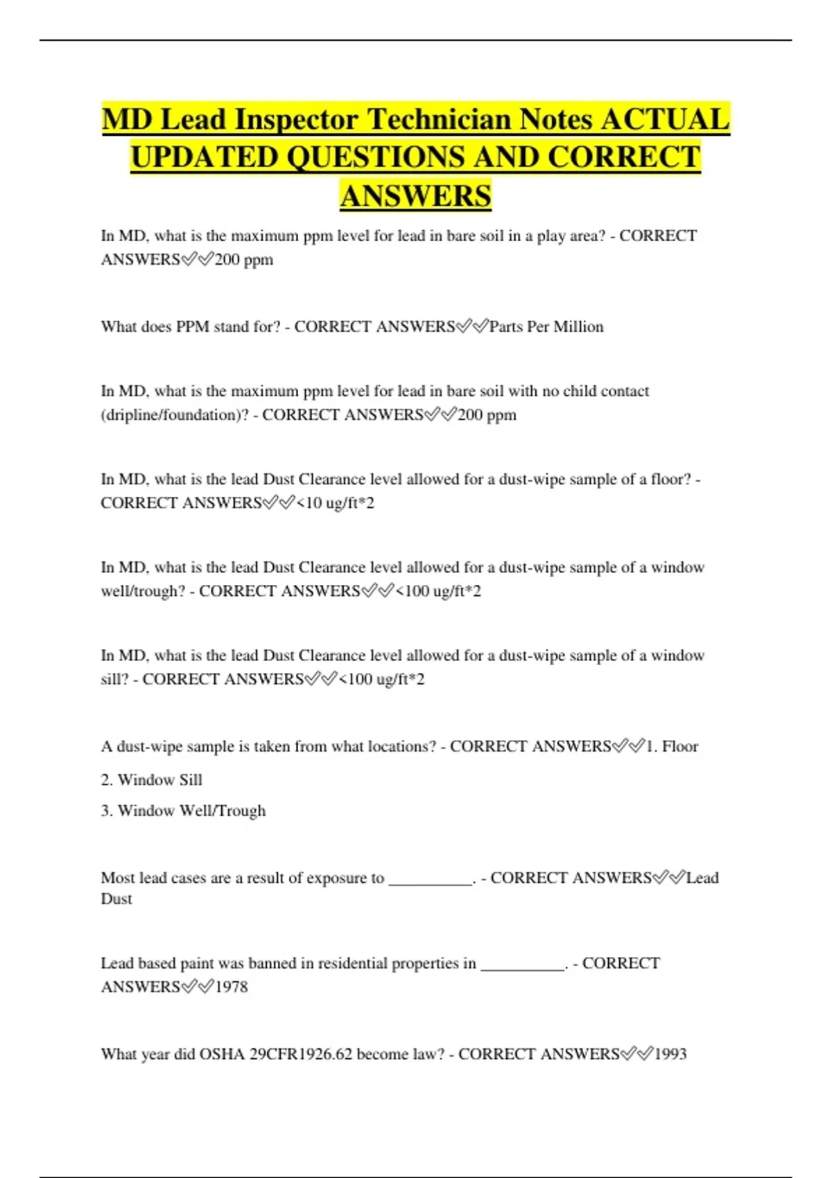 MD Lead Inspector Technician Notes ACTUAL UPDATED QUESTIONS AND CORRECT ANSWERS In MD, what is the maximum ppm level for lead in bare soil in a play area? - CORRECT ANSWERS200 ppm What does PPM stand for? - CORRECT ANSWERSParts Per Million In MD, what is the maximum ppm level for lead in bare soil with no child contact (dripline/foundation)? - CORRECT ANSWERS200 ppm In MD, what is the lead Dust Clearance level allowed for a dust-wipe sample of a floor? - CORRECT ANSWERS<10 ug/ft*2 In MD, what is the lead Dust Clearance level allowed for a dust-wipe sample of a window well/trough? - CORRECT ANSWERS<100 ug/ft*2 In MD, what is the lead Dust Clearance level allowed for a dust-wipe sample of a window sill? - CORRECT ANSWERS<100 ug/ft*2 A dust-wipe sample is taken from what locations? - CORRECT ANSWERS1. Floor 2. Window Sill 3. Window Well/Trough Most lead cases are a result of exposure to __________. - CORRECT ANSWERSLead Dust Lead based paint was banned in residential properties in __________. - CORRECT ANSWERS1978 What year did OSHA 29CFR1926.62 become law? - CORRECT ANSWERS1993 Who are most at risk of lead poisoning? - CORRECT ANSWERS1. Children under 6 2. Pregnant Woman How does lead enter the body? - CORRECT ANSWERS1. Inhalation 2. Ingestion What organs are affected by lead poisoning? - CORRECT ANSWERSAll Organs Where does lead usually end up stored in the body? - CORRECT ANSWERSBo