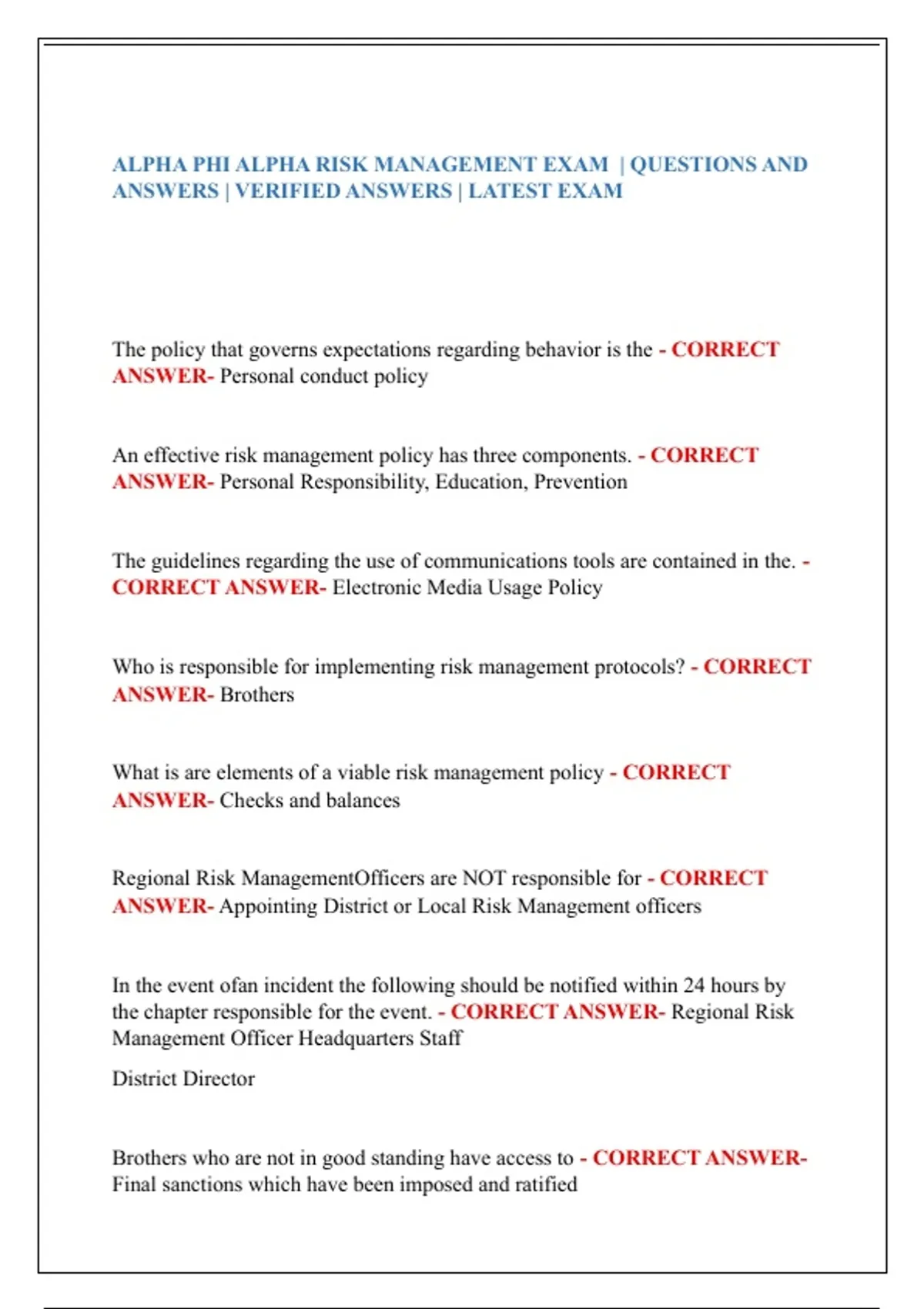 ALPHA PHI ALPHA RISK MANAGEMENT EXAM | QUESTIONS AND ANSWERS | VERIFIED ANSWERS | LATEST EXAM