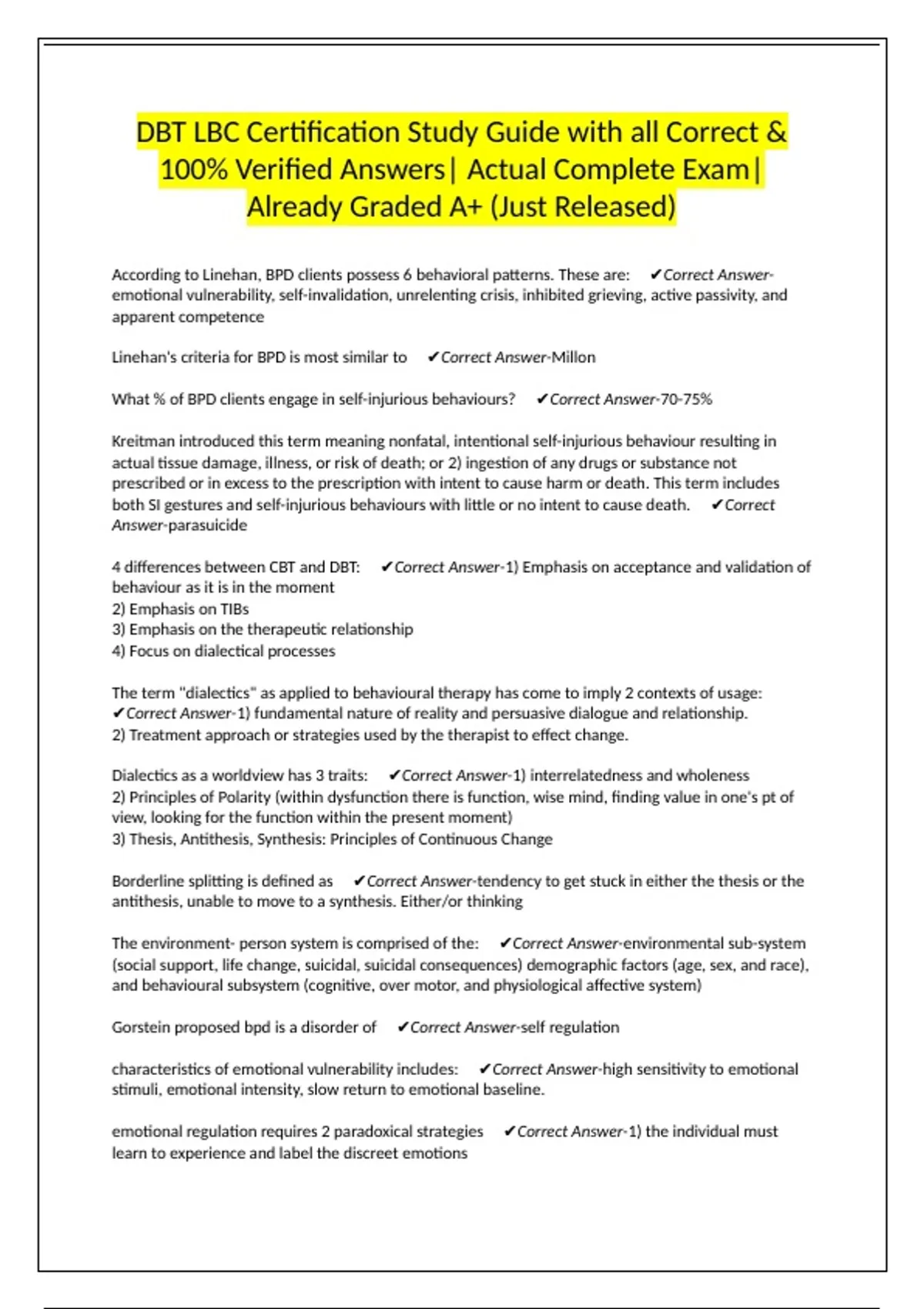 DBT LBC Certification Study Guide with all Correct & 100% Verified Answers| Actual Complete Exam| Already Graded A+ (Just Released)