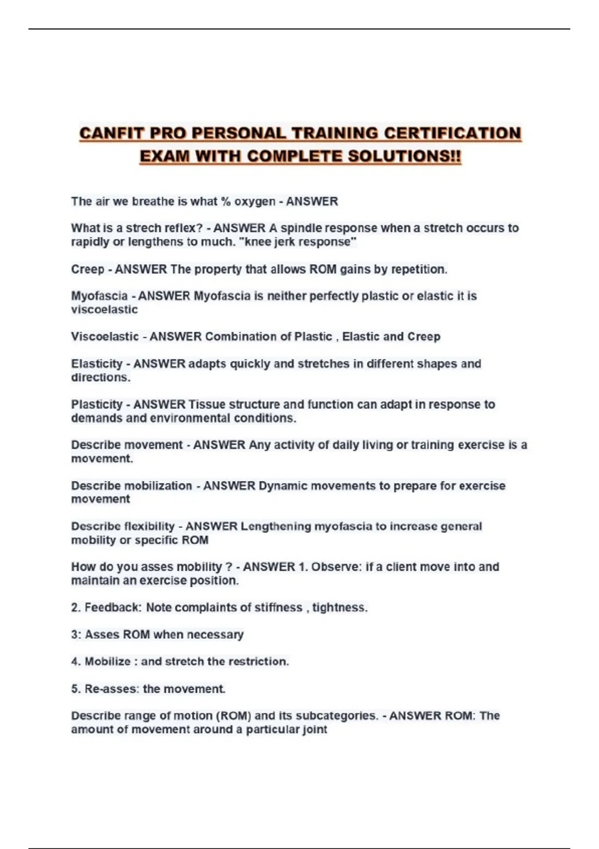 CANFIT PRO PERSONAL TRAINING CERTIFICATION EXAM WITH COMPLETE SOLUTIONS!!...
