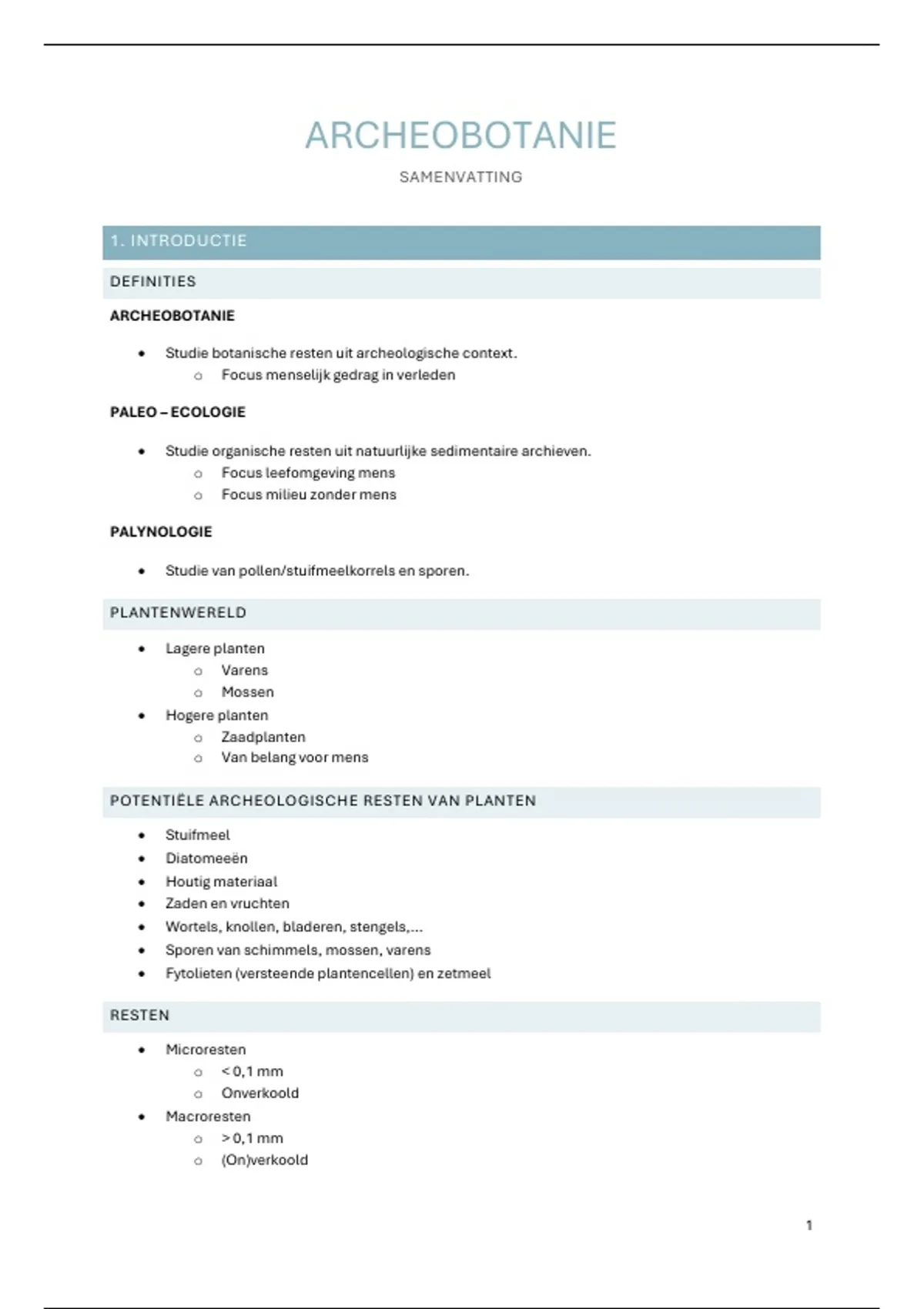 Heldere, volledige samenvatting van alle onderwerpen in archeobotanie: tafonomie, landbouweconomie, dieetreconstructie, dendrochronologie, vegetatiereconstructie en de besproken casussen. Perfect om tijd te besparen en toch goed voorbereid te zijn.