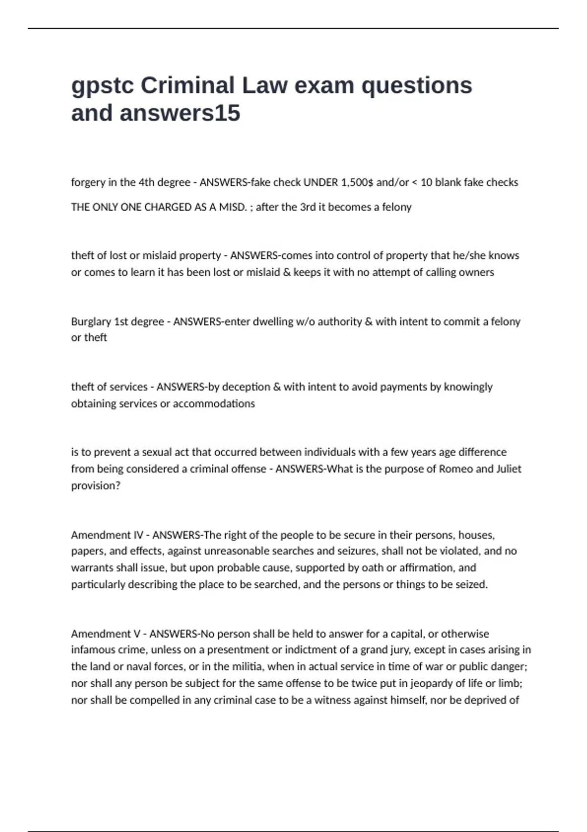 gpstc Criminal Law exam questions and answers forgery in the 4th degree - ANSWERS-fake check UNDER 1,500$ and/or < 10 blank fake checks THE ONLY ONE CHARGED AS A MISD. ; after the 3rd it becomes a felony theft of lost or mislaid property - ANSWERS-comes into control of property that he/she knows or comes to learn it has been lost or mislaid & keeps it with no attempt of calling owners Burglary 1st degree - ANSWERS-enter dwelling w/o authority & with intent to commit a felony or theft theft of services - ANSWERS-by deception & with intent to avoid payments by knowingly obtaining services or accommodations is to prevent a sexual act that occurred between individuals with a few years age difference from being considered a criminal offense - ANSWERS-What is the purpose of Romeo and Juliet provision? Amendment IV - ANSWERS-The right of the people to be secure in their persons, houses, papers, and effects, against unreasonable searches and seizures, shall not be violated, and no warrants shall issue, but upon probable cause, supported by oath or affirmation, and particularly describing the place to be searched, and the persons or things to be seized. Amendment V - ANSWERS-No person shall be held to answer for a capital, or otherwise infamous crime, unless on a presentment or indictment of a grand jury, except in cases arising in the land or naval forces, or in the militia, when in actual service in time of war or public danger; nor shall any person be subject for the same offense to be twice put in jeopardy of life or limb; nor shall be compelled in any criminal case to be a witness against himself, nor be deprived of