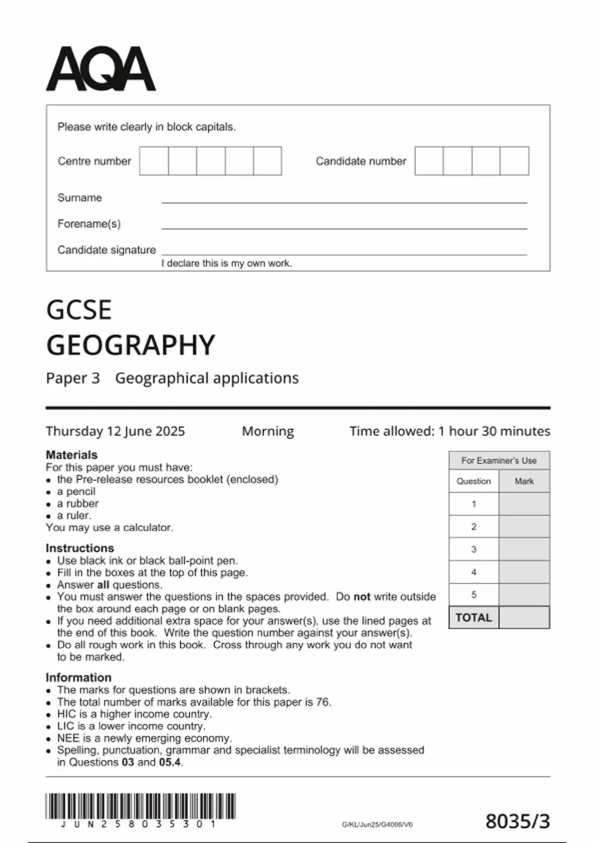2025 AQA GCSE GEOGRAPHY Paper 3 (8035/3: Geographical applications)