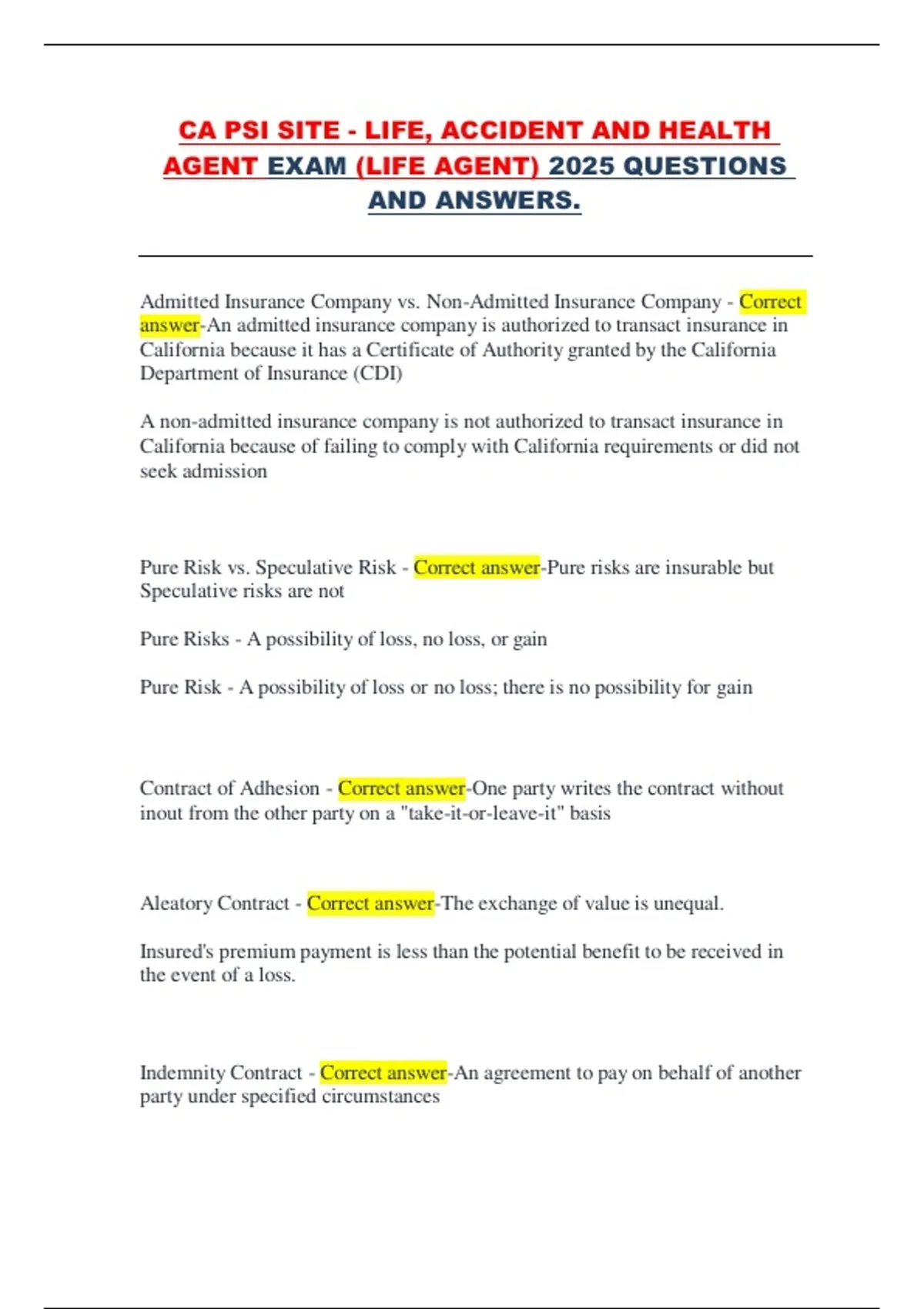 Aleatory Contract - Correct answer-The exchange of value is unequal.