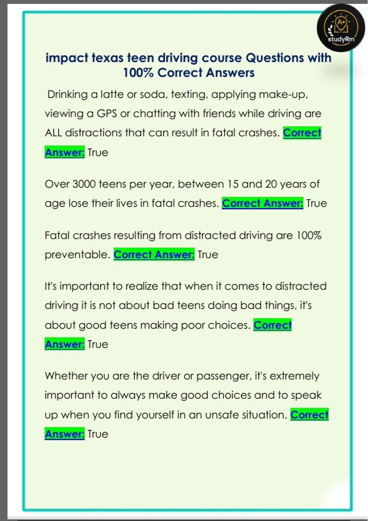 impact texas teen driving course Questions with 100% Correct Answers impact texas teen driving course Questions with 100% Correct Answers
